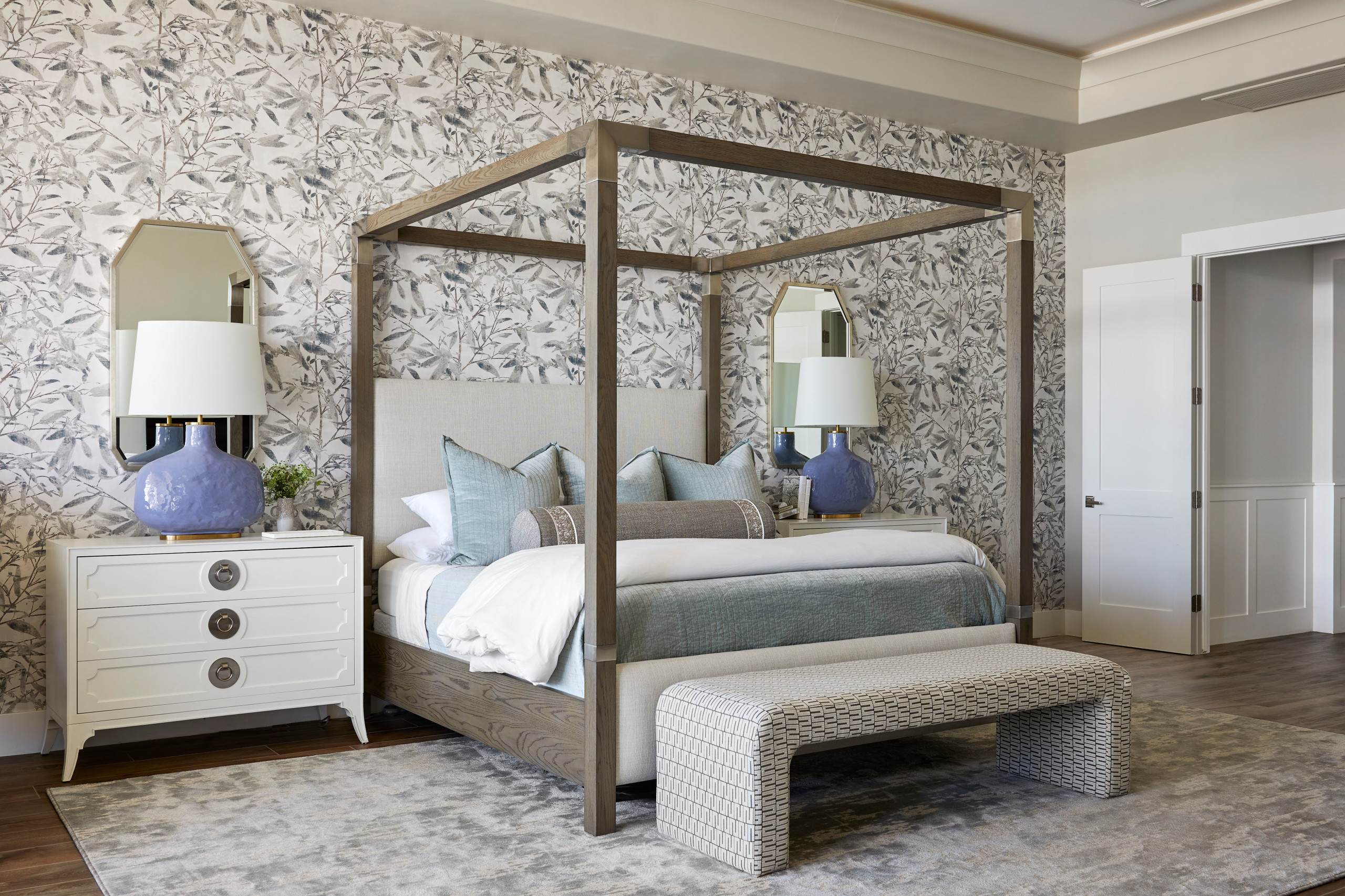 Main feature. “Our jumping-off point in the space was the headboard-wall wallpaper,” Simon says. “It gave an overall earthy and tranquil feel to the room and became our jumping-off point for the color palette throughout.”