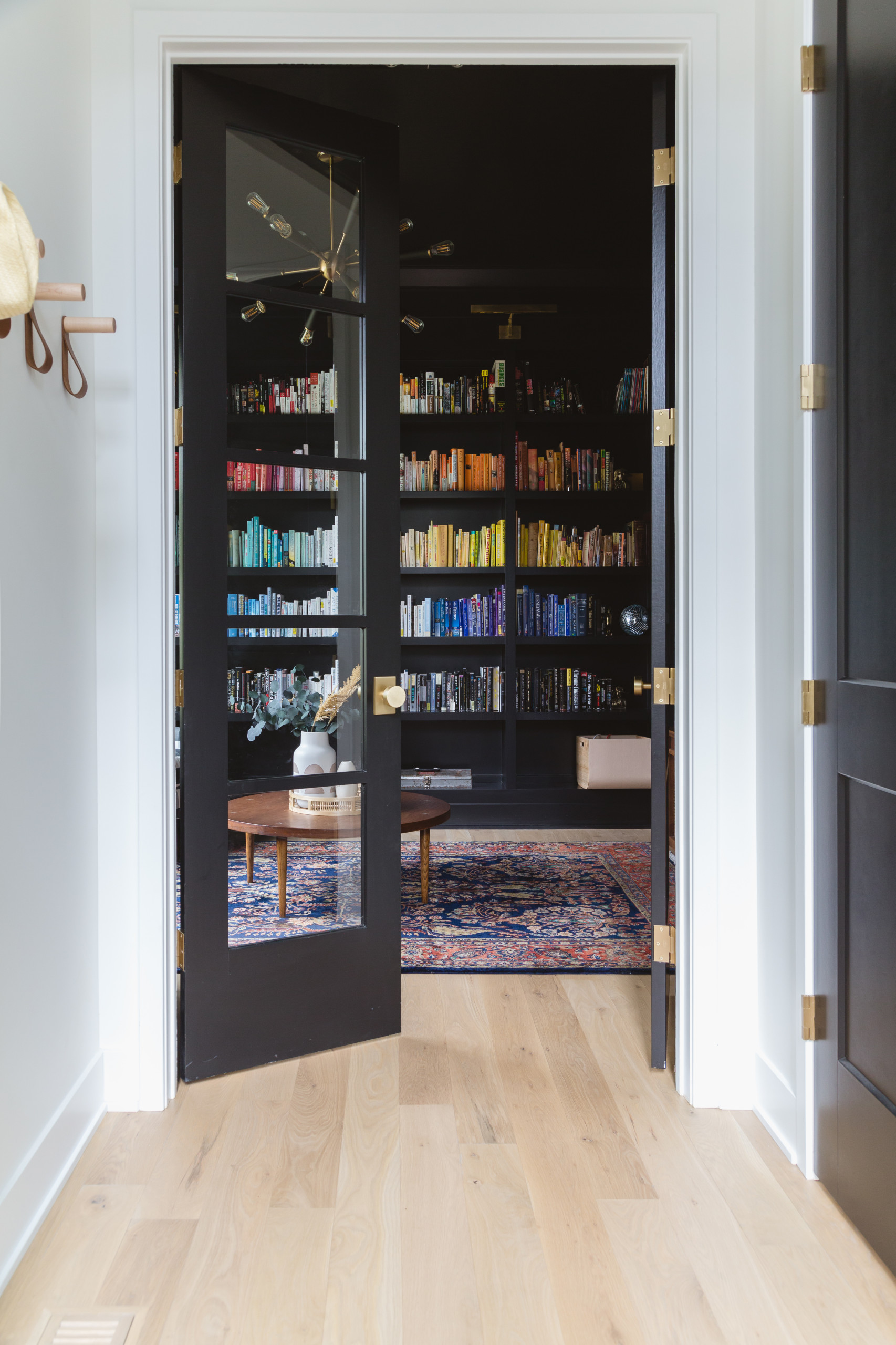 This is a peek into the library, which can be accessed through French doors near the home’s front door or via a pocket door near the kitchen. The black walls, ceiling and trim painted in Sherwin-Williams’ Tricorn Black signal a transition from light and bright to dark and quiet. Color-coded books on the shelves provide a vibrant place for the eye to rest. The Sputnik chandelier, visible just past the doors, is from Crystorama.