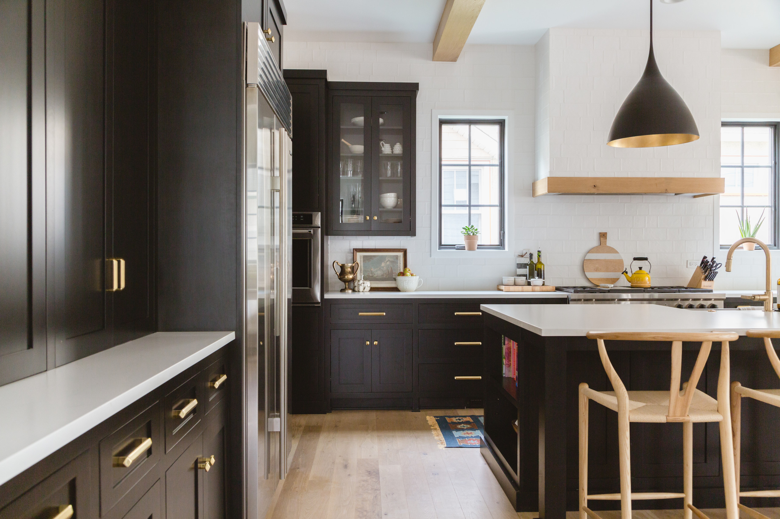 The ebony-stained kitchen cabinets are a classic contrast to the white quartz counters. When it came to the home’s interior design and color scheme, Elise says, she thought about it one room at a time, keeping in mind the overall look she wanted to achieve. “Early on I pictured what I wanted each room to look like. I had a vision for what I wanted, so when the time came to pick a faucet, for example, I had a general idea, going with mostly brass. When picking fixtures and lighting, I wanted it to feel somewhat traditional with clean lines, so that narrowed down the field.”