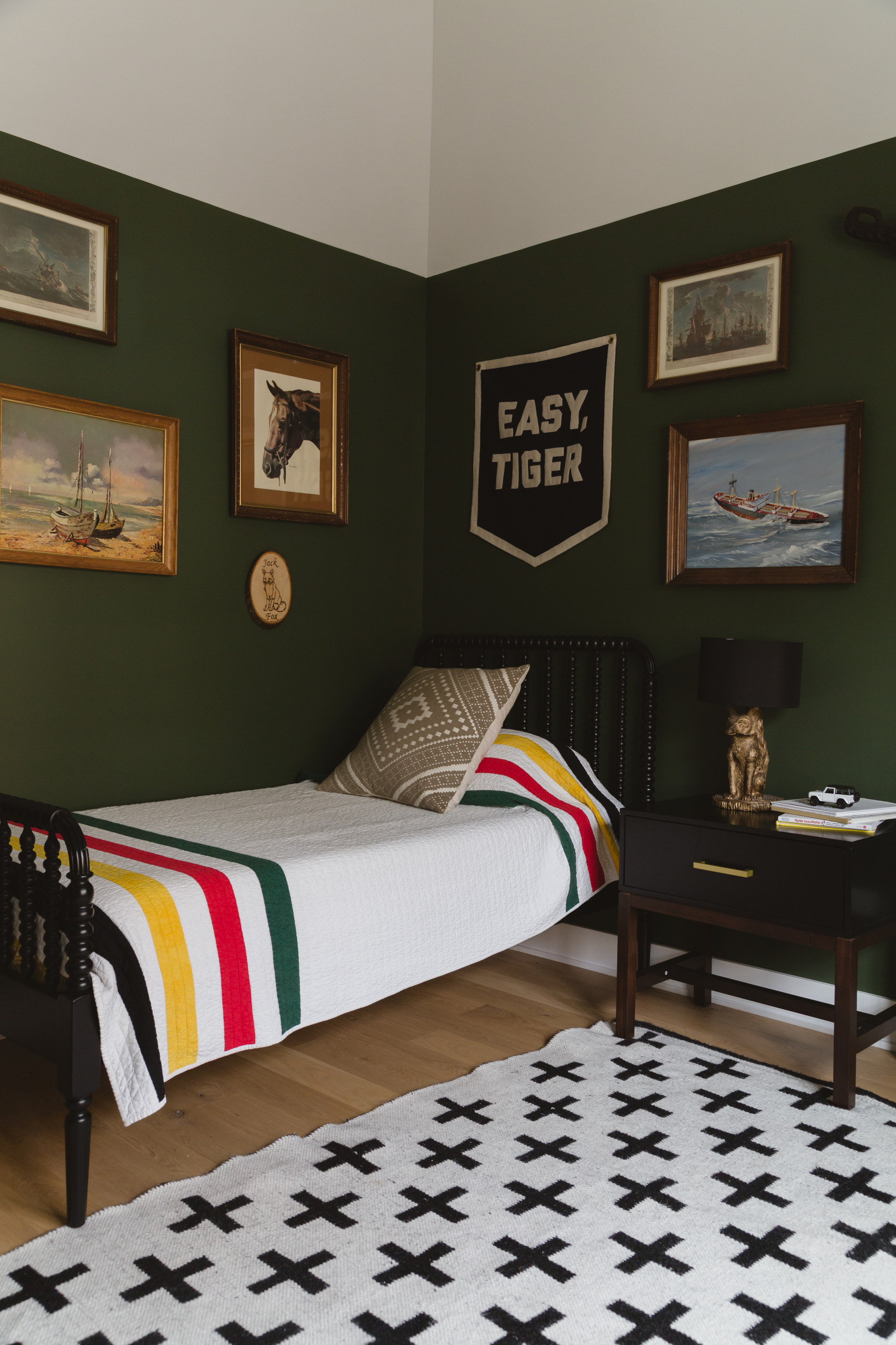 Elise’s mother made the quilt on Jack’s Jenny Lind-style bed. Most of the art on Jack’s walls is from his grandparents’ basements, Elise says. “We went through all their old art, scavenged horse art from my parents. There’s a photo on the wall of my grandfather on a trip to Hawaii years ago; it’s collected stuff we had. Every time we find a random piece from Goodwill, it ends up in Jack’s room.”