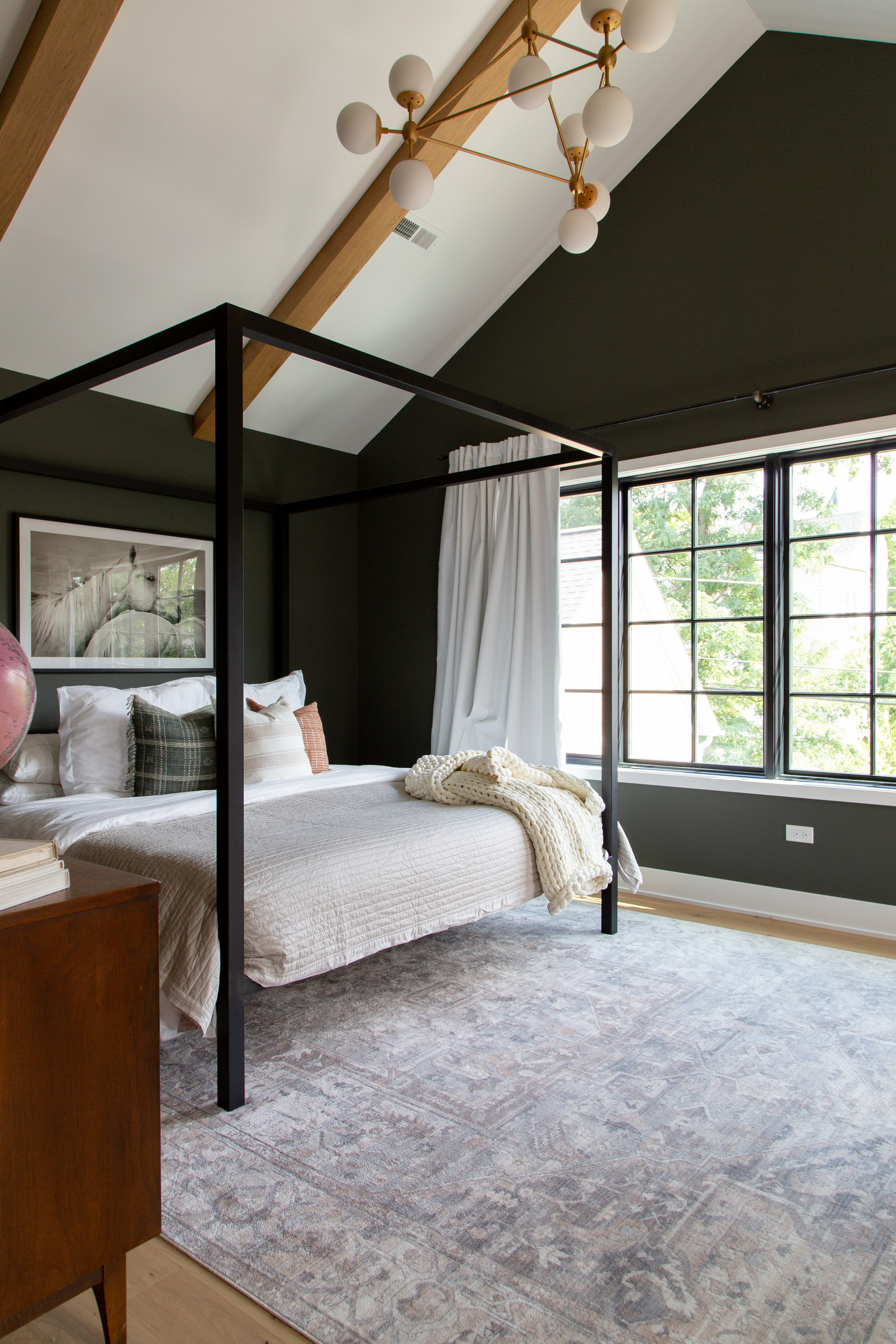 Wall paint: Night Owl, Sherwin-Williams; 10-light triangular chandelier, Dainolite