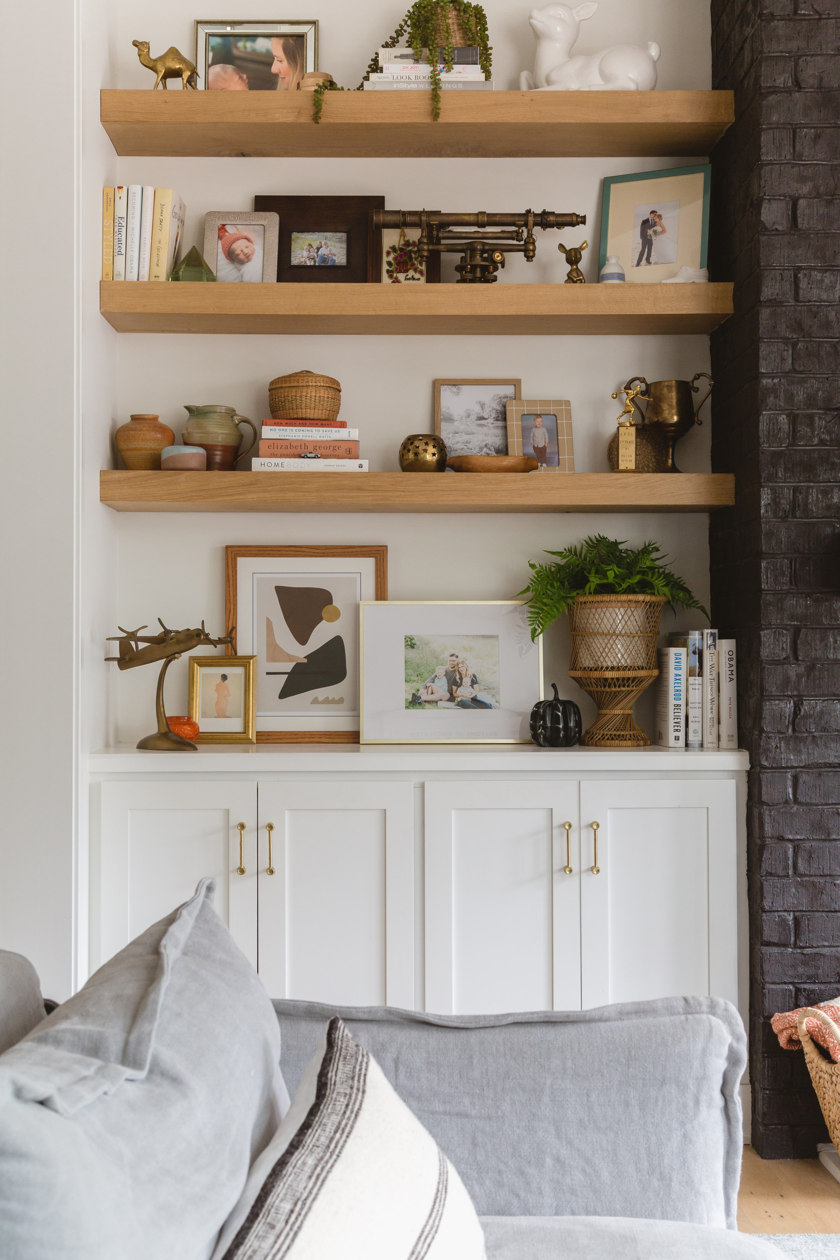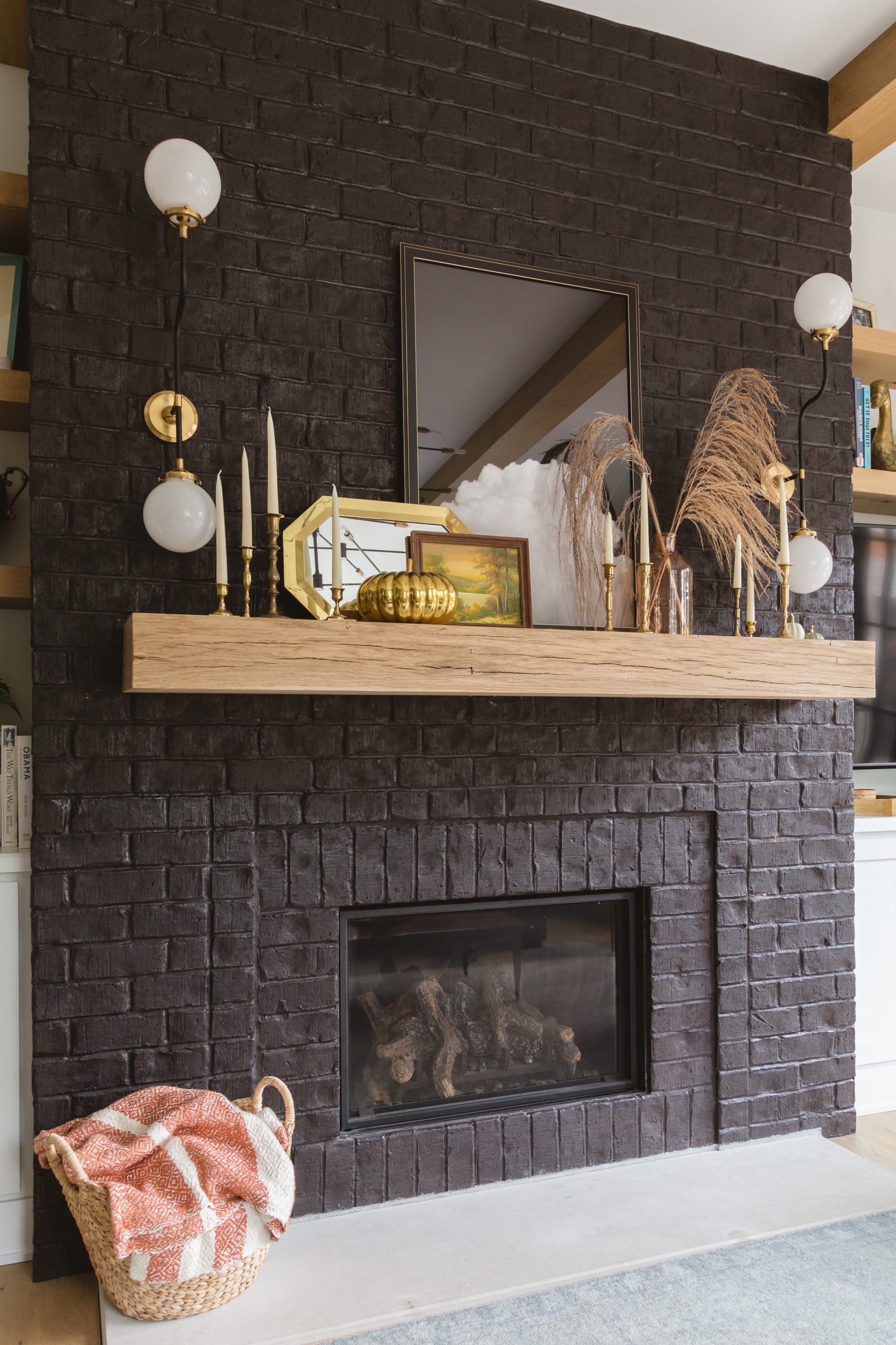 The gas fireplace is across from the couch, and a TV is to the right of it on the built-in shelving unit. The brick surrounding the fireplace is painted in Tricorn Black by Sherwin-Williams, to contrast with the white walls and blonde wood. The oak mantel holds vintage items from antique stores and Goodwill, and is refreshed often. “I switch things out constantly,” Elise says.
