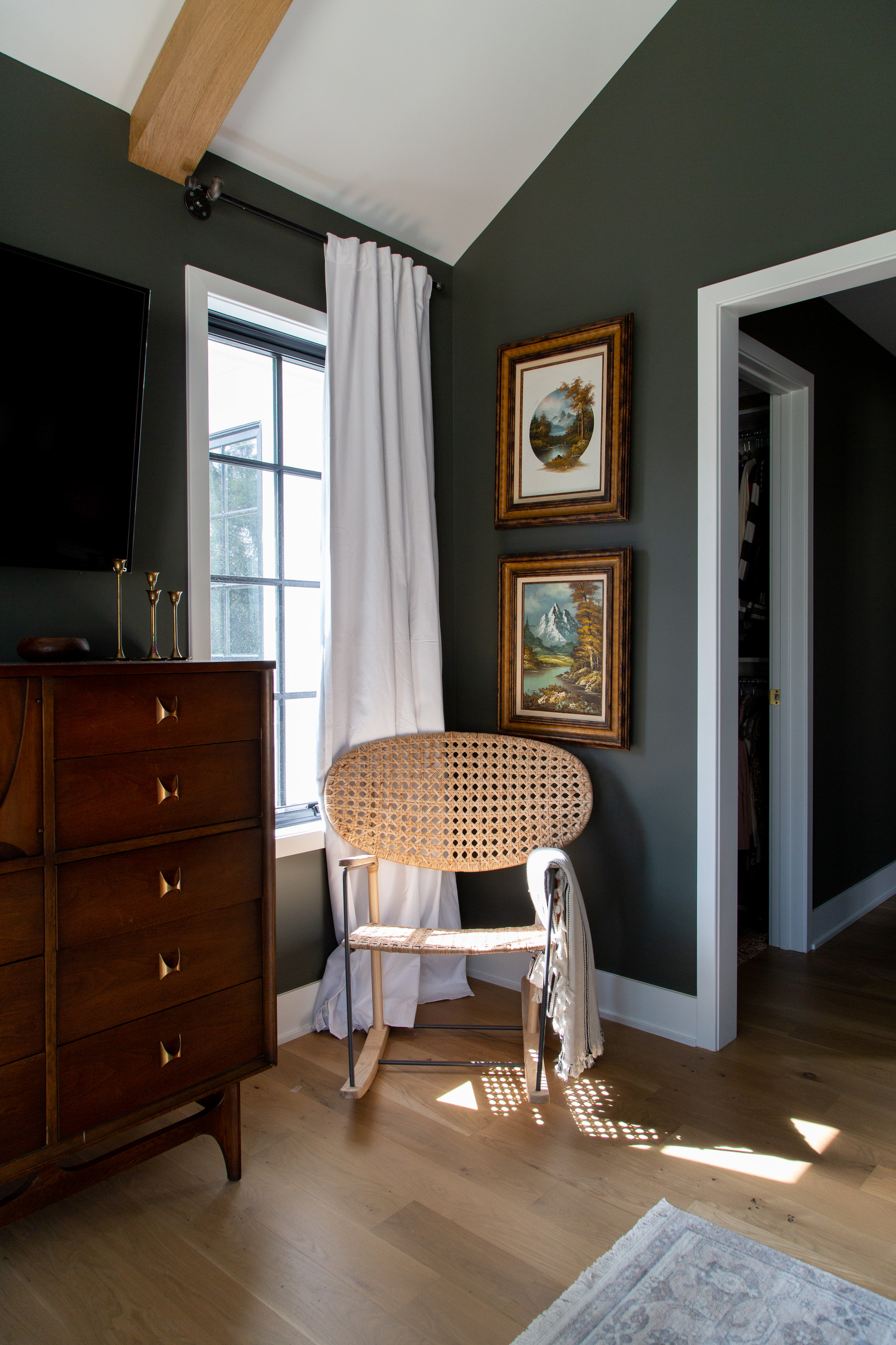 This cozy corner of the master bedroom has one of a set of vintage dressers from Broyhill Furniture.