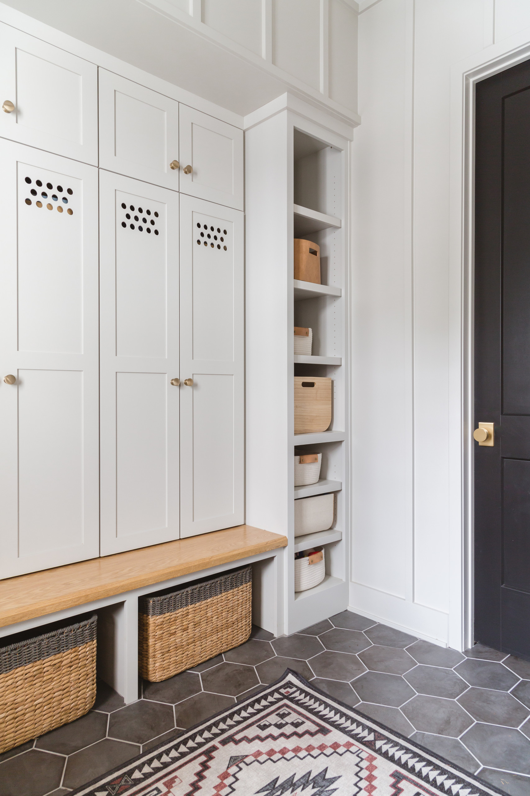 Here’s a look inside the mudroom, which features custom wood cabinets with holes in them to make them look like lockers. The board-and-batten walls and lockers are painted a soft gray to contrast with the dark gray porcelain hexagon floor tiles, which have a slate chalkboard look. The door leads to a tiny deck on the back of the house that steps down and leads to a detached garage.