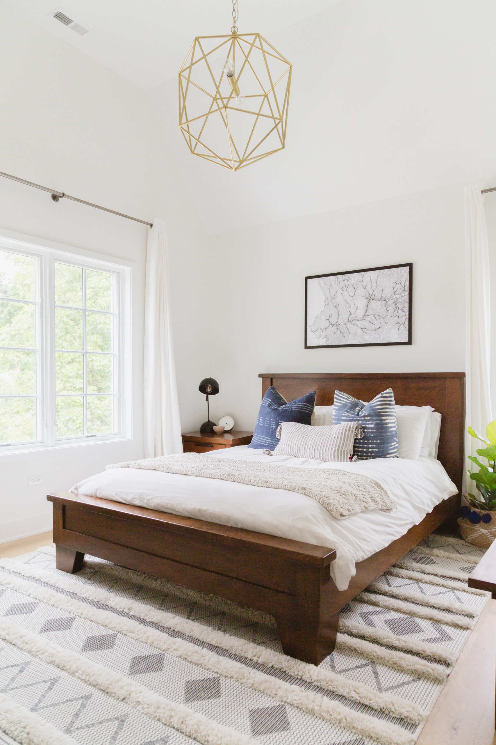 The guest bedroom has a light and bright boho chic style, with walls painted in Decorator’s White by Benjamin Moore and neutral tones in the bed linens and rug. An open geometric pendant light adds to the airy feel. The art over the bed is a topographic map line drawing of Yosemite National Park from Erik Linton of LintonArt.