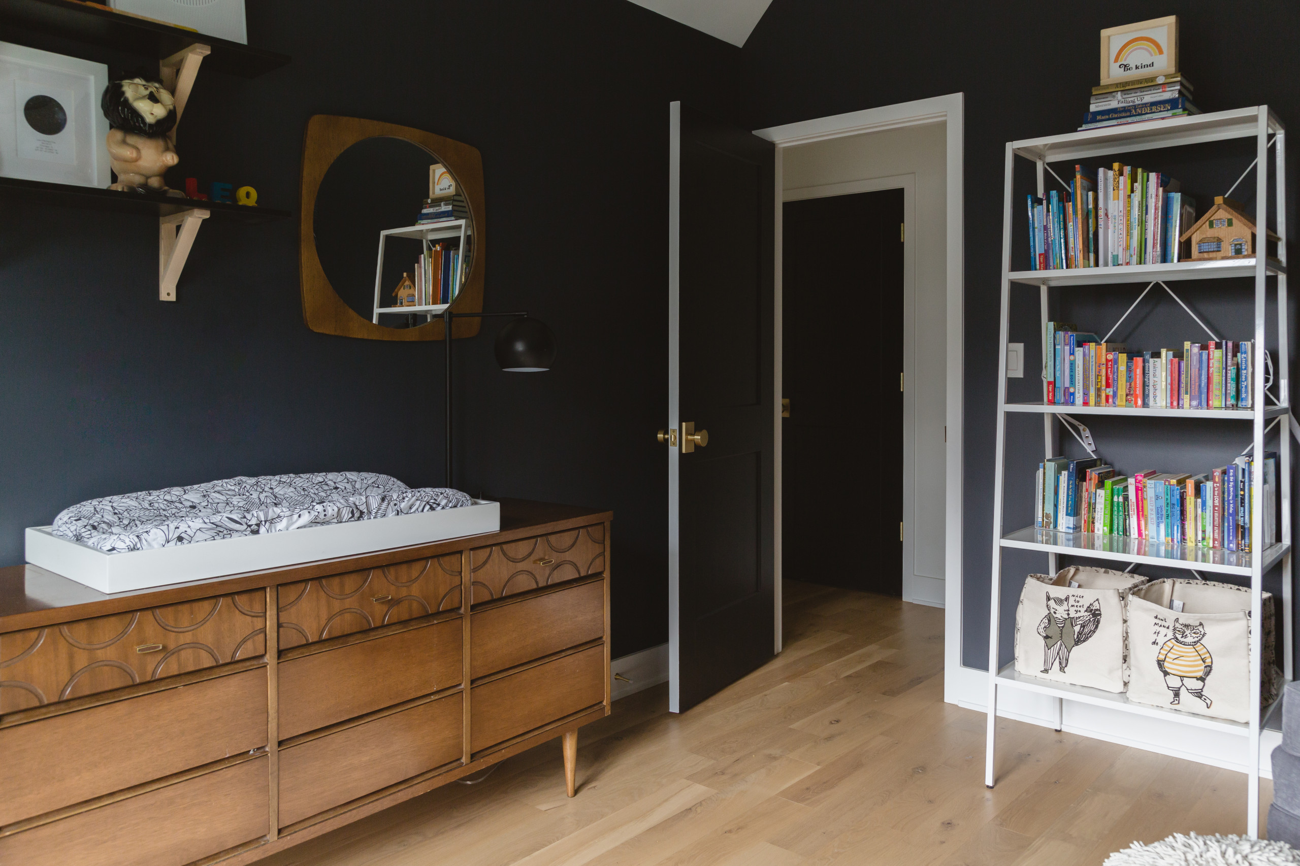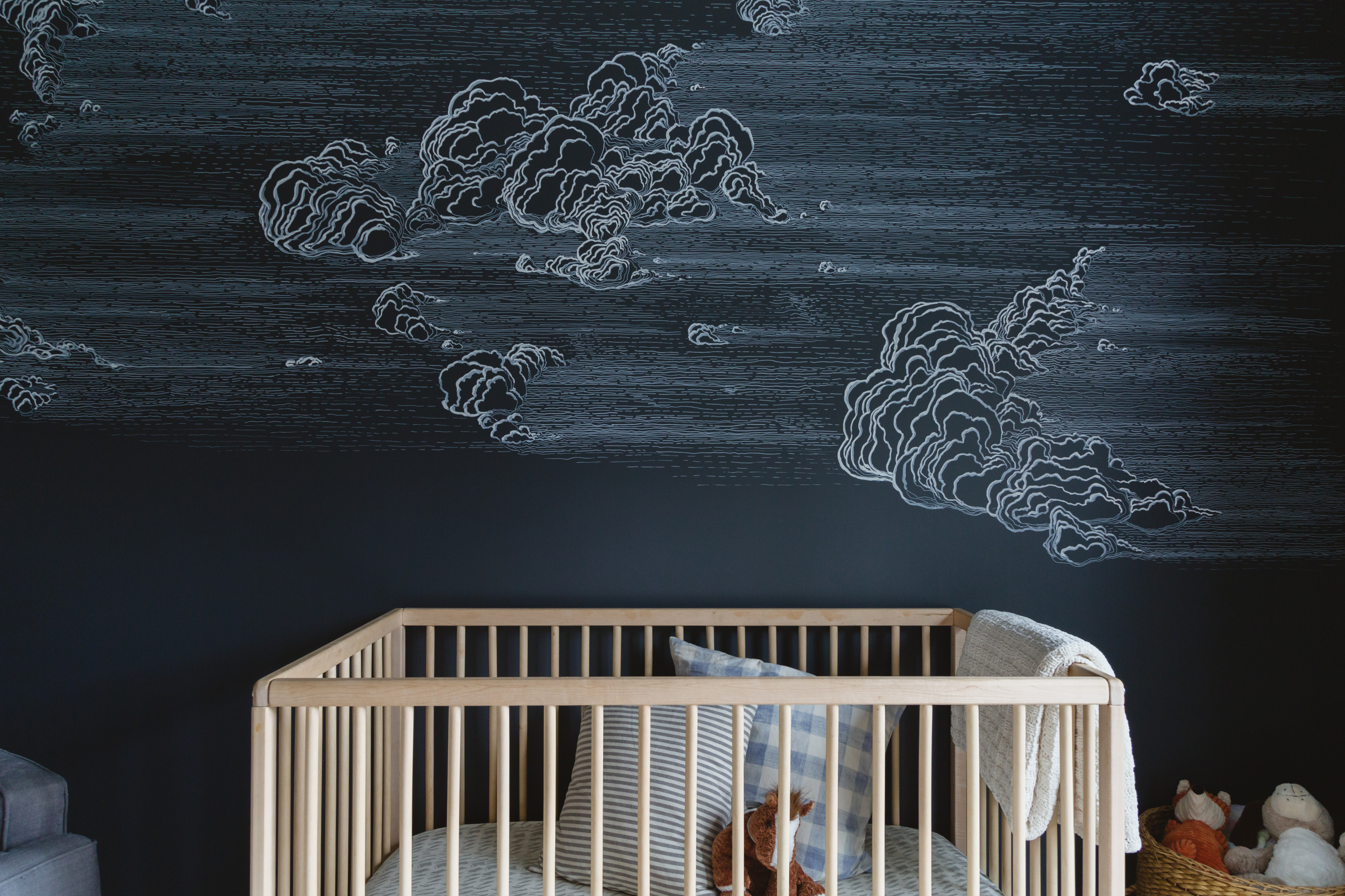 Standard baby colors were avoided in 2-year-old Leo’s room in favor of a sophisticated palette of deep blues, grays and neutrals. The walls are painted a moody dark blue-gray called Cyberspace from Sherwin-Williams. Bill used an oil-based white felt-tip pen to draw the cloud patterns on the wall behind the crib. “He spent a weekend with a laser level making a lot of lines,” Elise says.