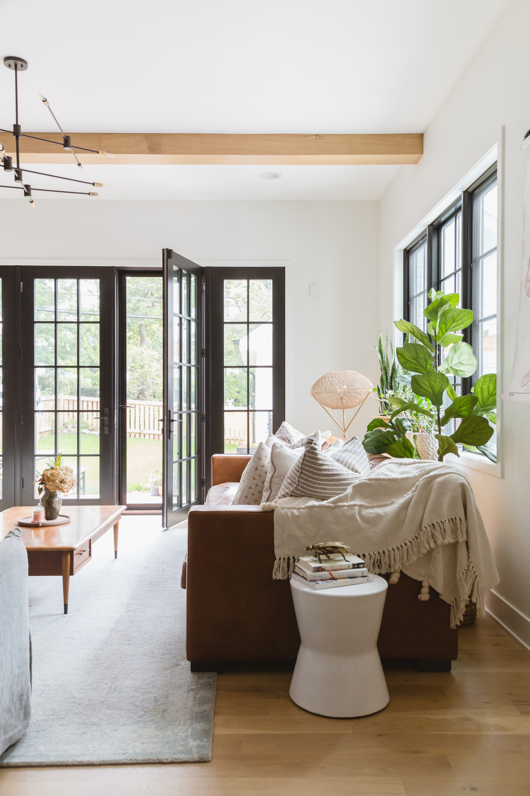 In the living room, a lack of window treatments means plenty of natural light comes in. The white oak floors throughout the house have a custom stain mixed with white and a matte finish to dial back the yellow tone.