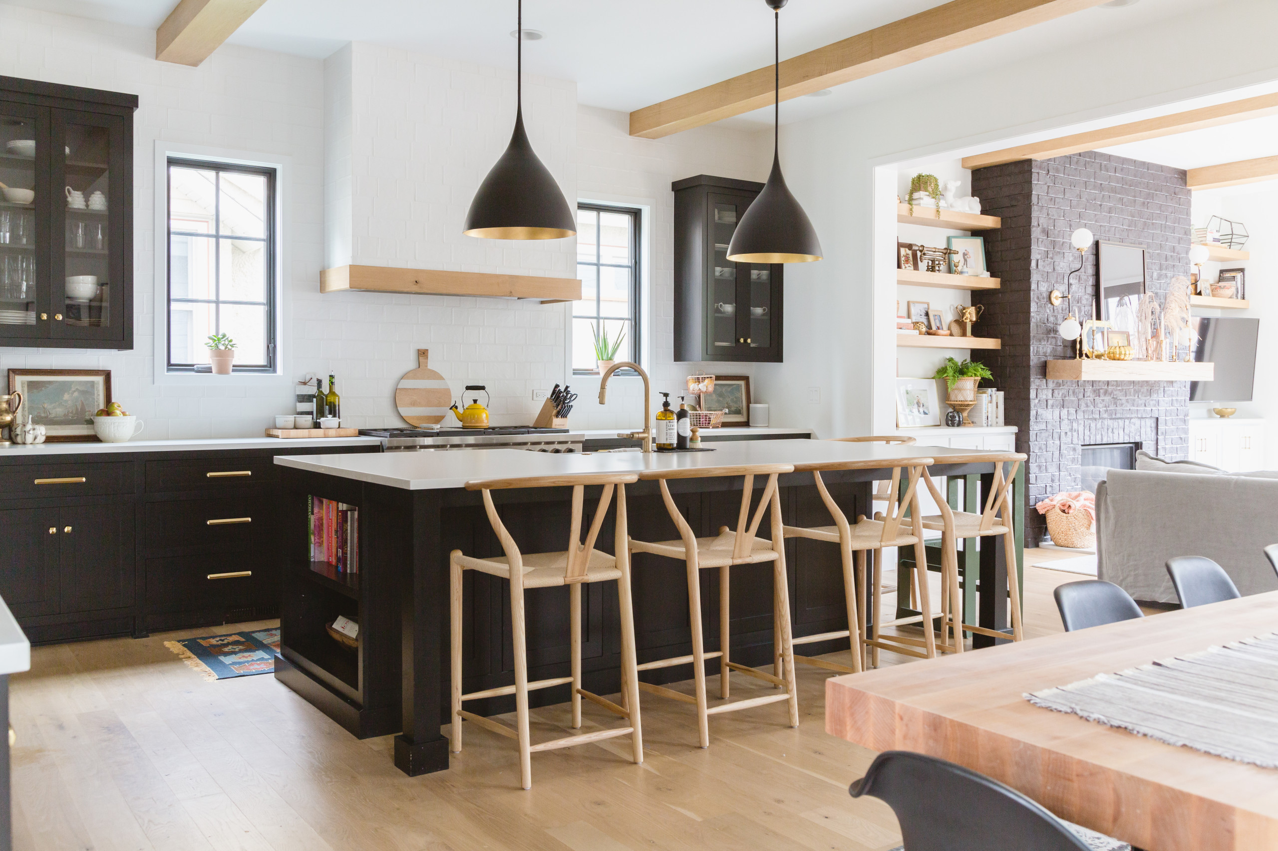The home’s black-and-white palette is softened by blonde wood ceiling beams and stools in the kitchen, as well as a butcher-block dining table. Some of the wood came from a 150-year-old oak tree that had to be cut down on the property. The kitchen’s large ebony-stained island seats six. “It becomes another dining table when friends or family come over, and it has plenty of storage,” Elise says. “There’s even more storage hidden by the chairs.”
