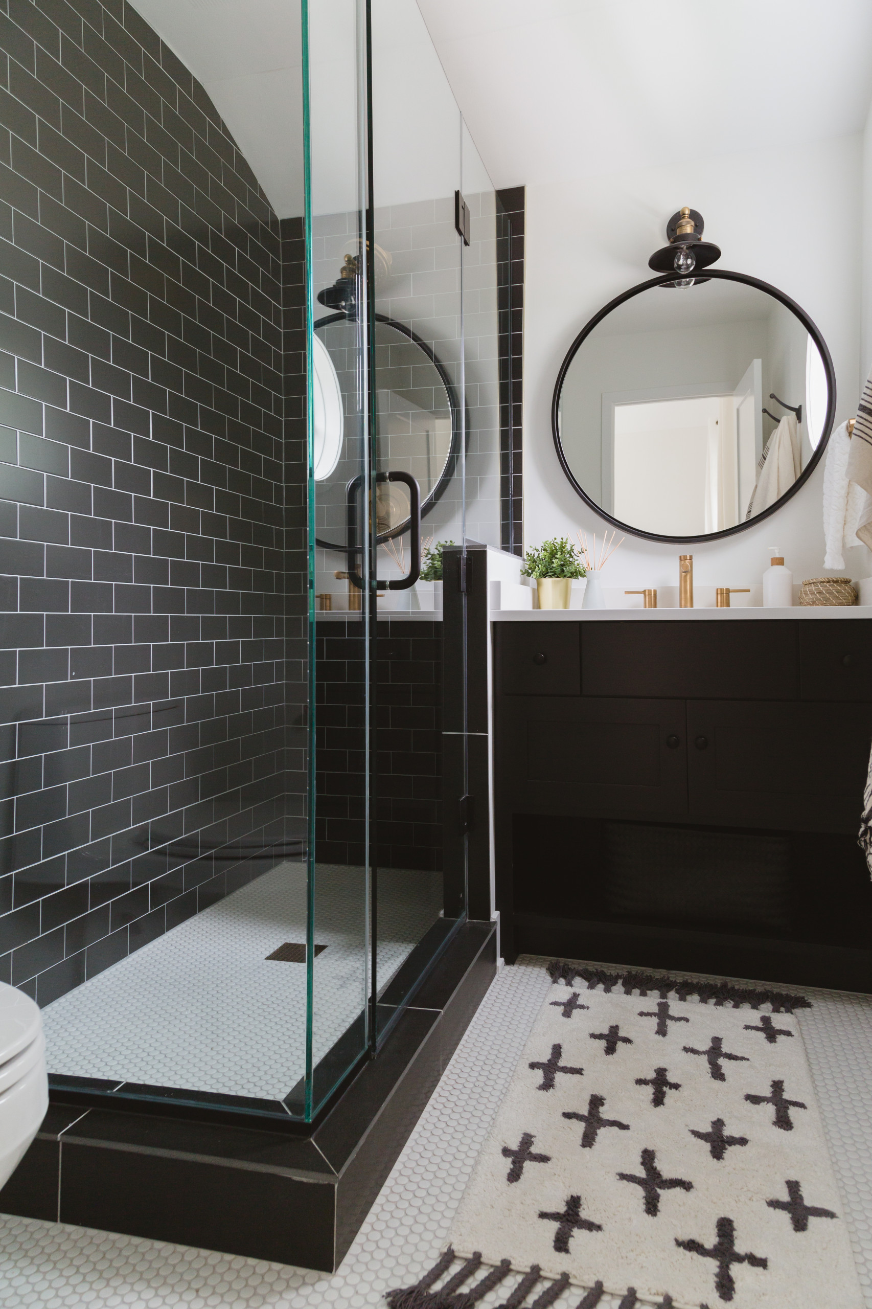 This is the guest bathroom, located on the second floor, which Elise says may end up being the kids’ bathroom someday. The black-and-white palette is designed to be timeless. “I wanted it to be a pretty space, not too mature but still fun and pretty. I really liked that black tile,” Elise says.