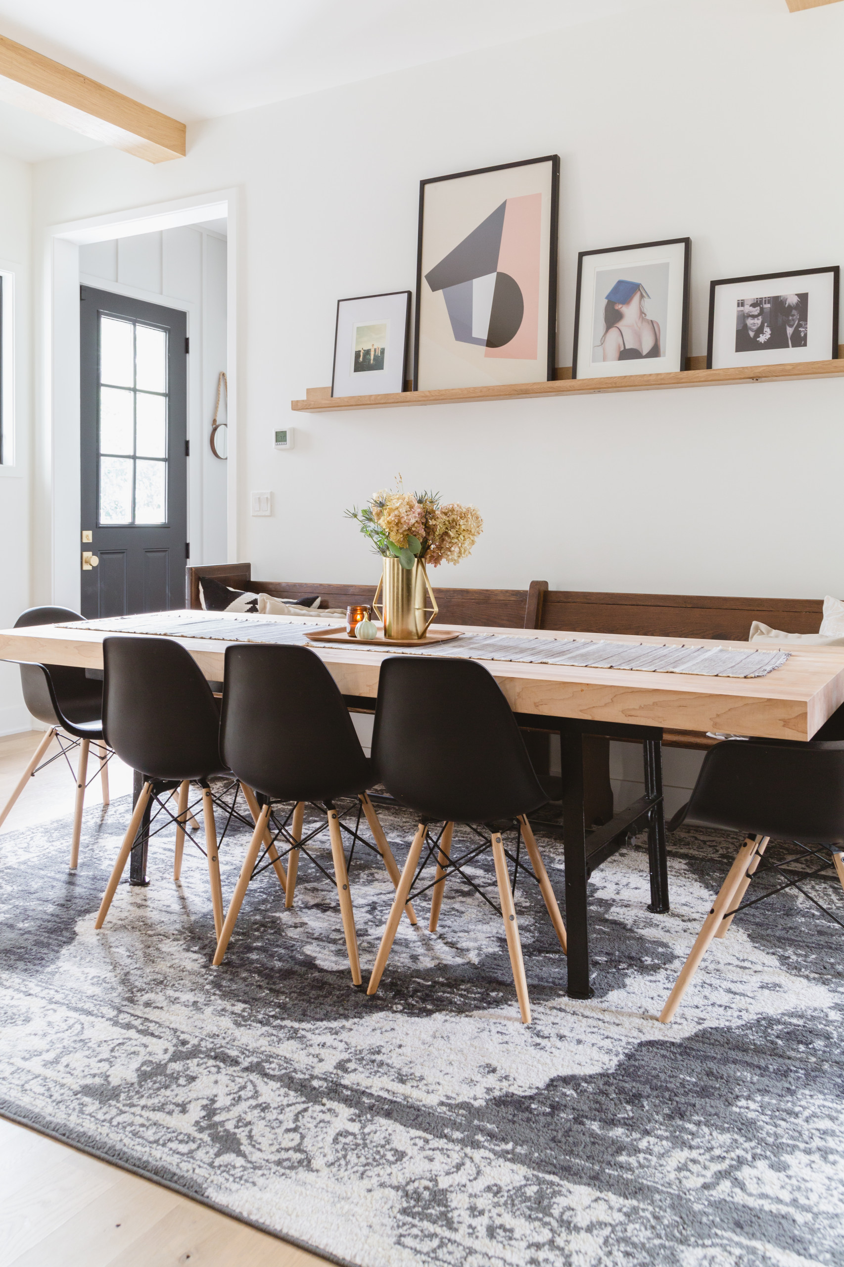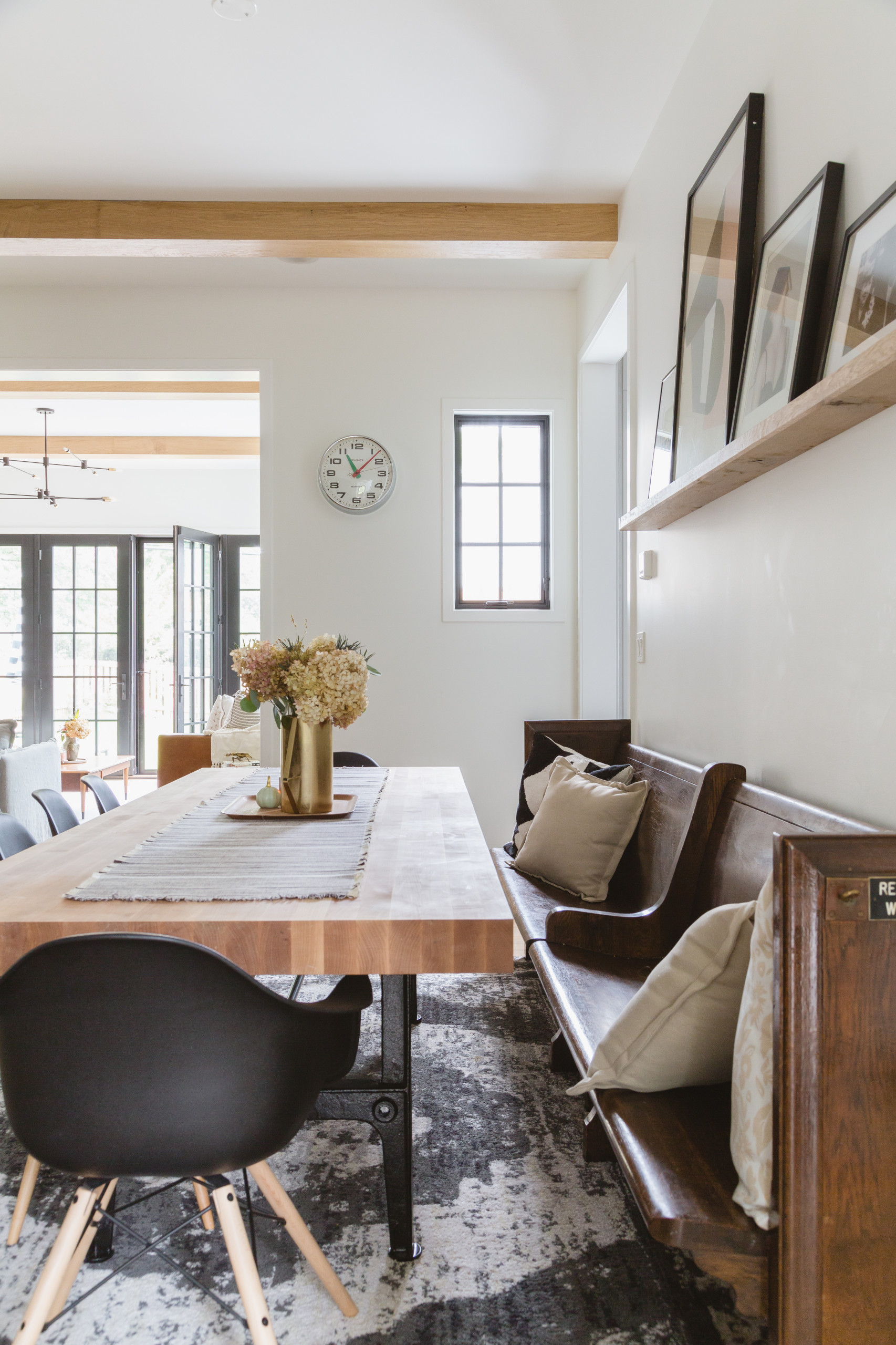 The dining area is tidy yet not uptight. “I wanted it to be formal enough to have a nice Thanksgiving meal but not so formal that kids couldn’t eat breakfast and get maple syrup all over,” Elise says. Bill made the picture ledge from the same oak that provided wood for the beams and mantel. He also made the dining table using a butcher block top from John Boos & Co. atop vintage cast iron legs.