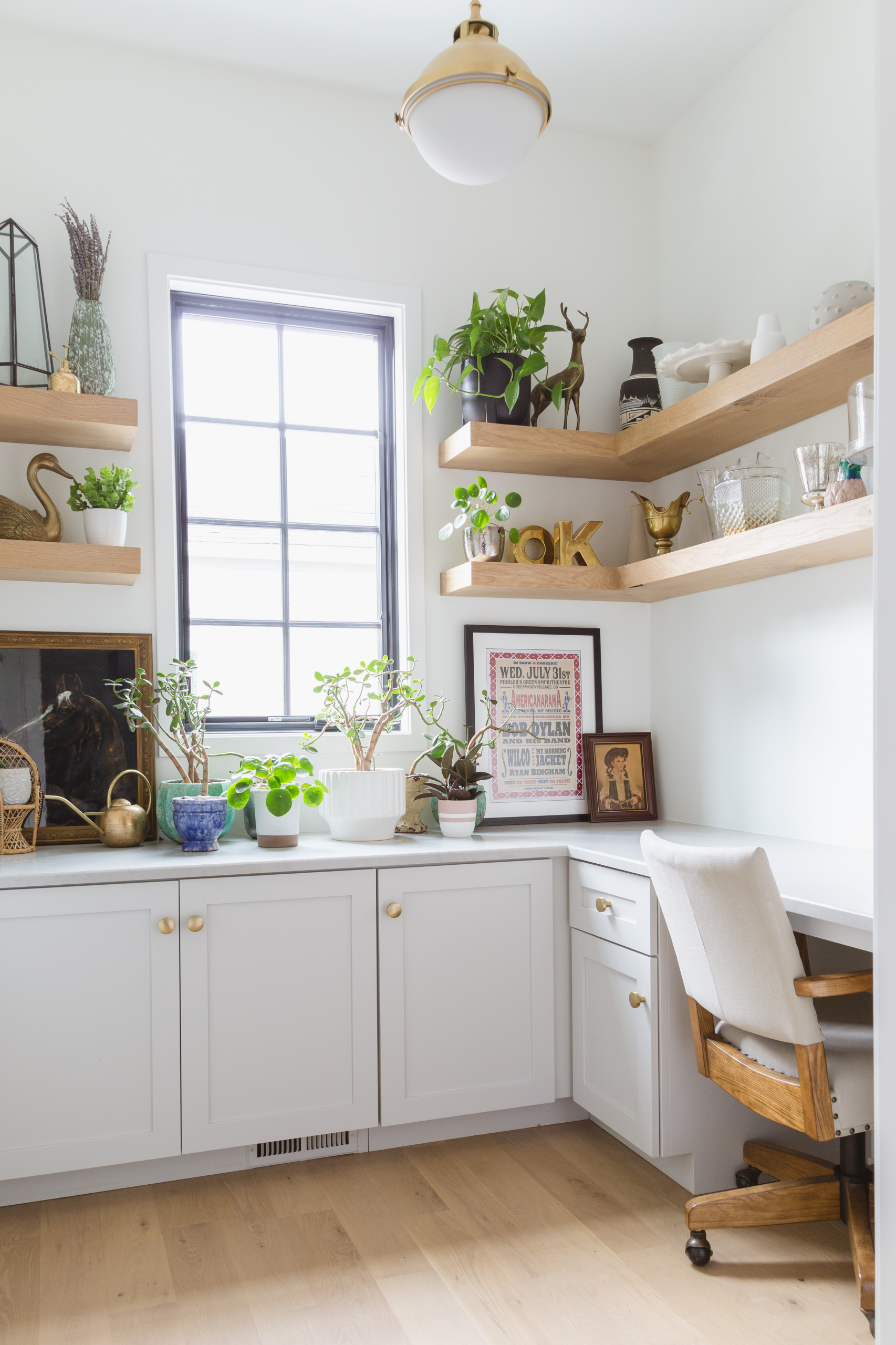 A home office next to the kitchen is largely Elise’s domain. It’s where she keeps a lot of her vintage vases and cake trays, along with a multitude of plants. “The room gets very good sun, so the plants are thriving, and the desk is for keeping me organized,” she says.