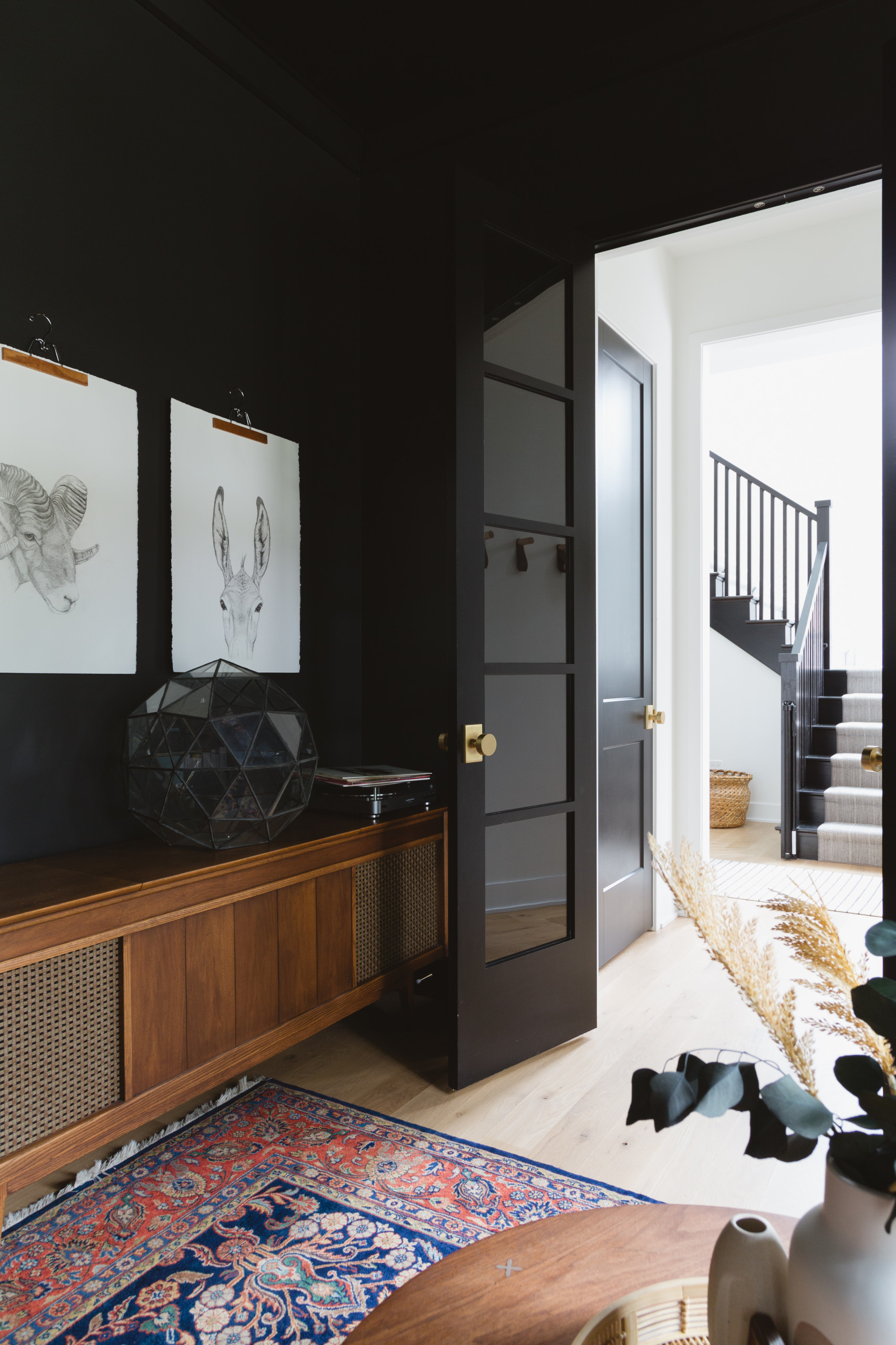Here’s another view out the library doors. The cabinet is a vintage record player console that the couple plan to fix, Elise says. Bill made the line drawings as a present to her. “I wanted a pair so commissioned him to draw them,” she says. They’re hanging from pants hangers. The black metal-and-glass dome on the console is a terrarium being used as a sculpture.