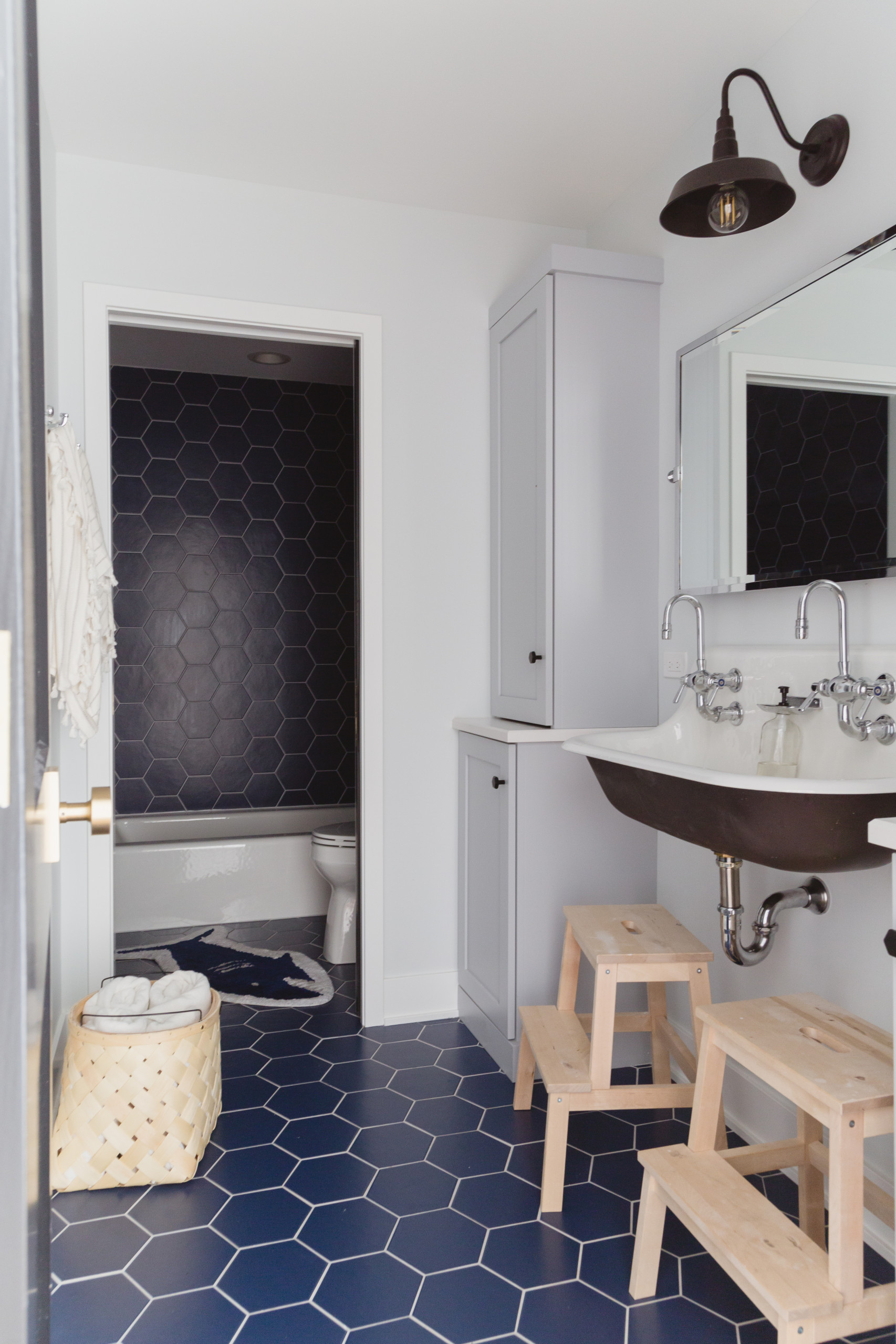 The boys’ bathroom contains classic elements like a Kohler wall-mounted trough sink and industrial-style light. Dark blue hexagonal tiles line the floor and shower.