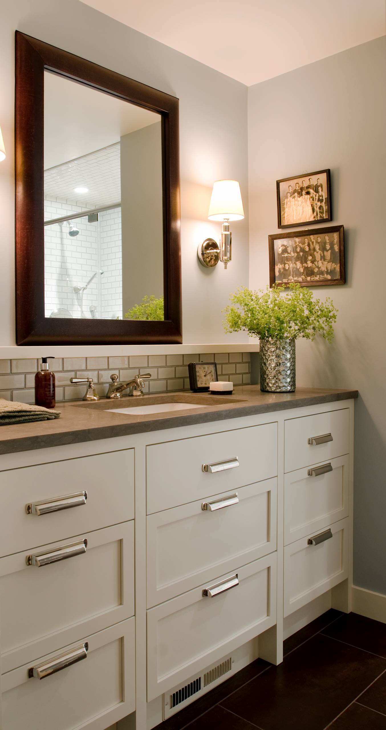 Bath hardware: Lugarno line, Restoration Hardware; vanity hardware: Duluth pulls, Restoration Hardware