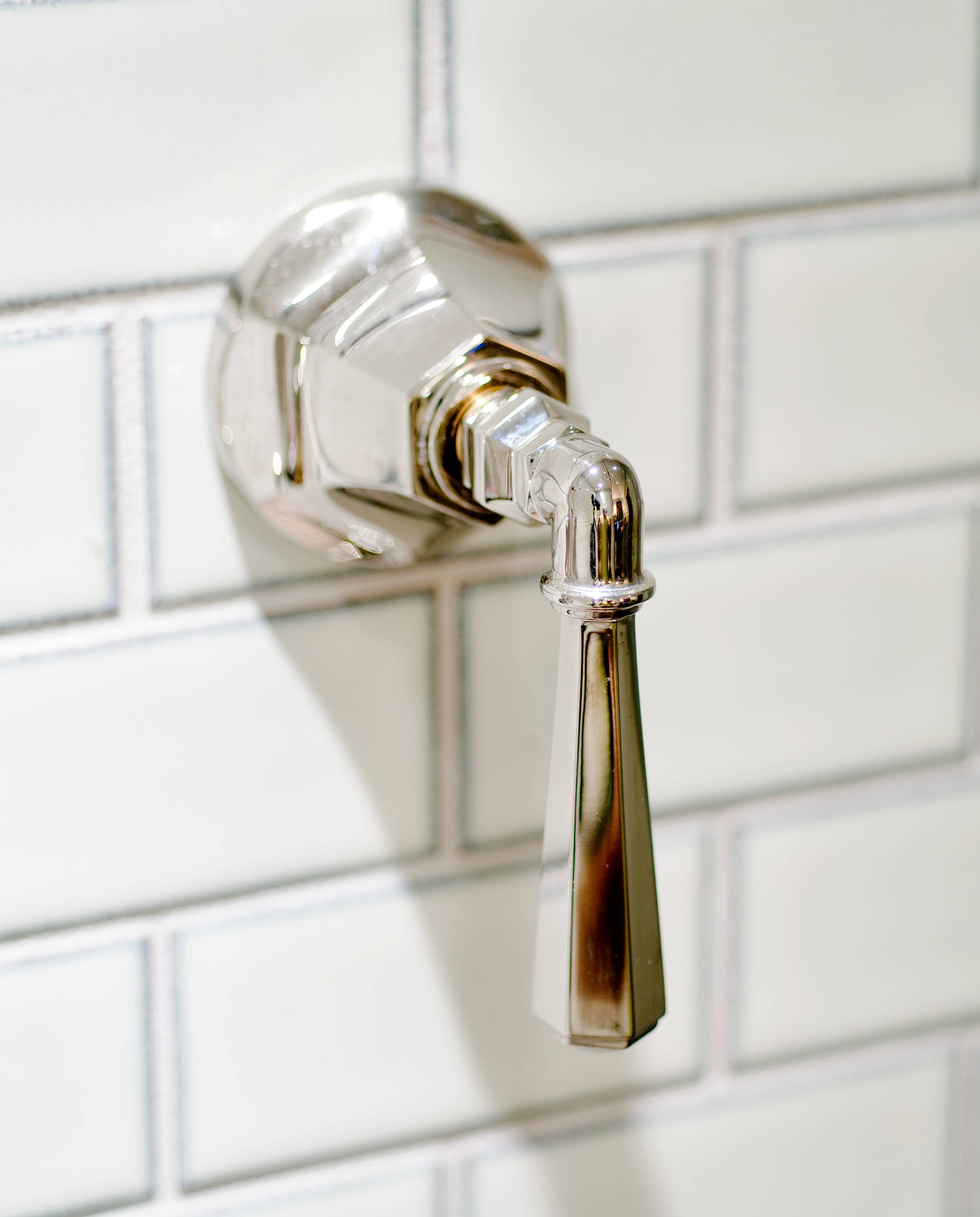 “I didn’t want to do just another subway tile, but I did want it to have universal appeal,” Crestin says of her shower tile selections. The 2- by 4-inch Ann Sacks tile was the right fit in size and color — its edges have a very subtle blue-gray tone that works well with the wall color. The penny round tiles on the shower floor are also from Ann Sacks and bring in some curves, like buttons bring to a pin-striped suit.