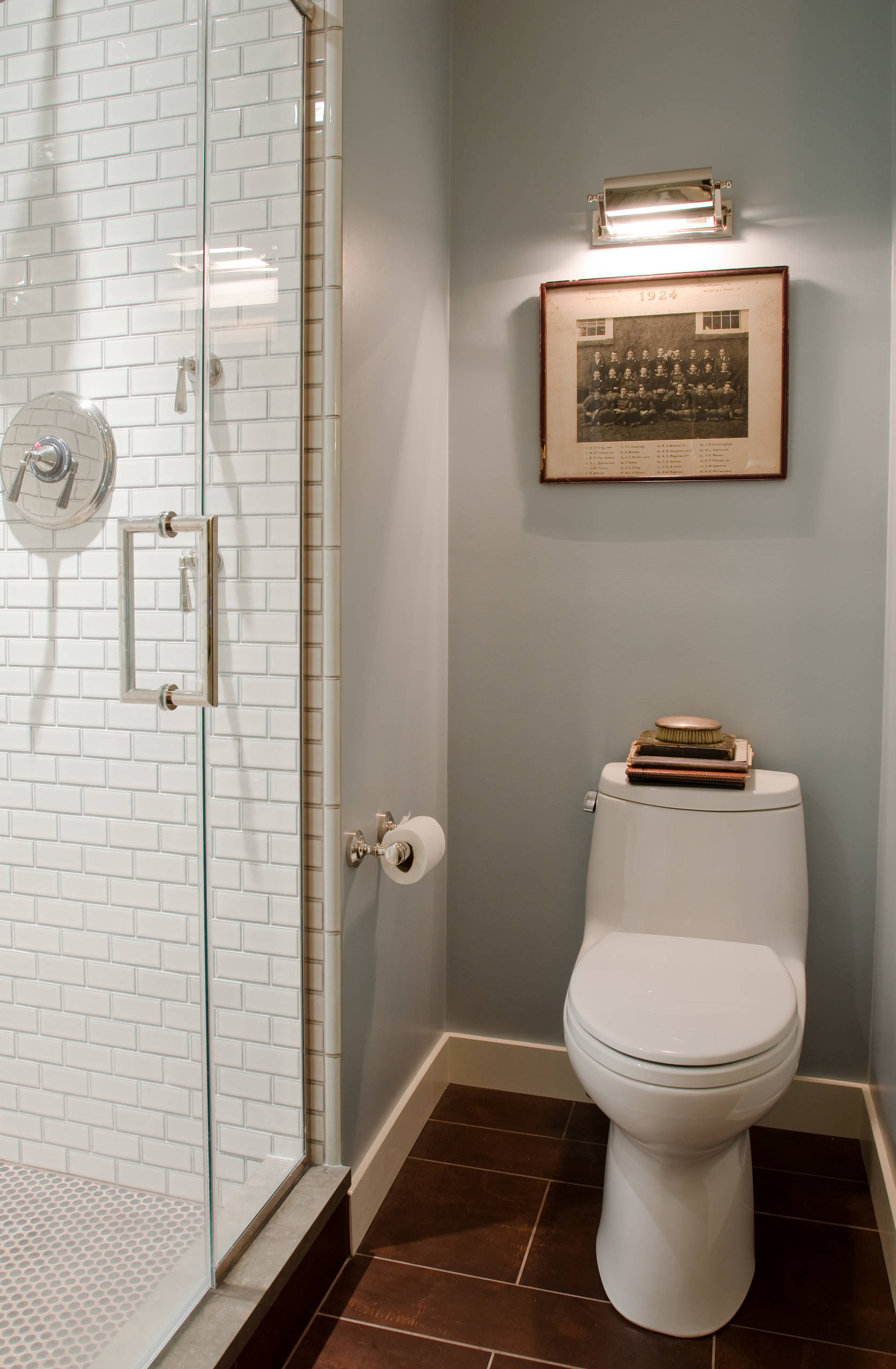 Next she chose a light blue-gray paint for the walls to complement the deep tones of the floor tile. The hue also keeps the room from looking strictly masculine.