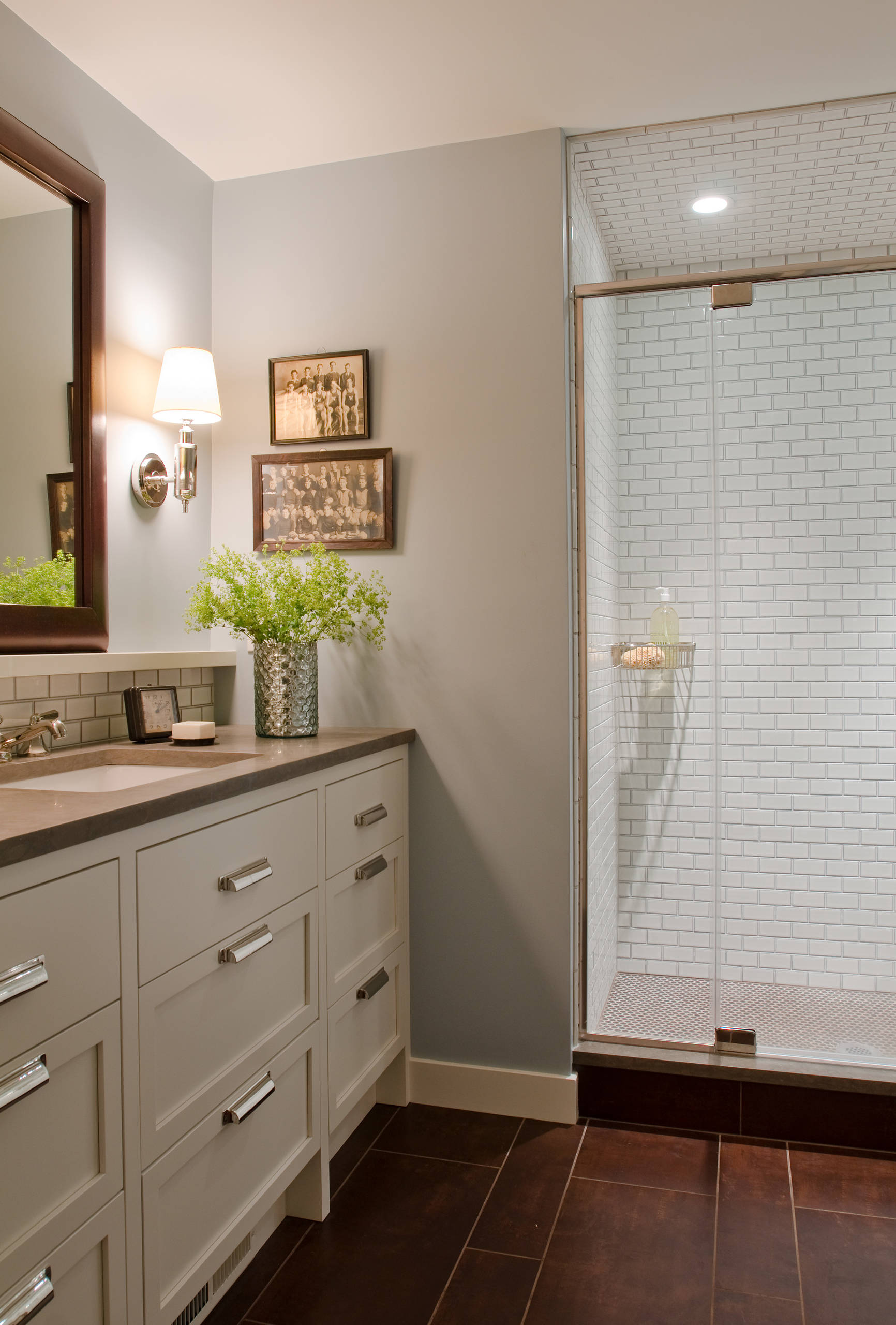 Shower and backsplash tile: 2- by 4-inch Savoy tile in Cottonwood, Ann Sacks; shower floor tile: ¾-inch penny round in bronze, Ann Sacks