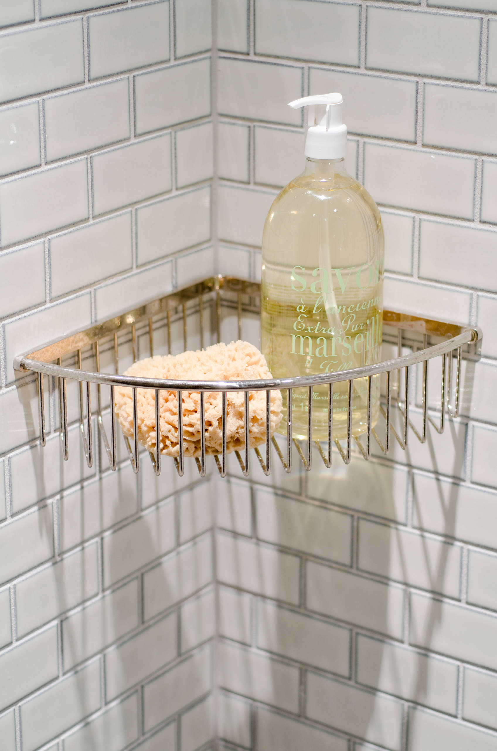 Small details matter. Crestin spent a lot of time seeking out fittings that were weighty and had presence, like this basket and the shower door handle.