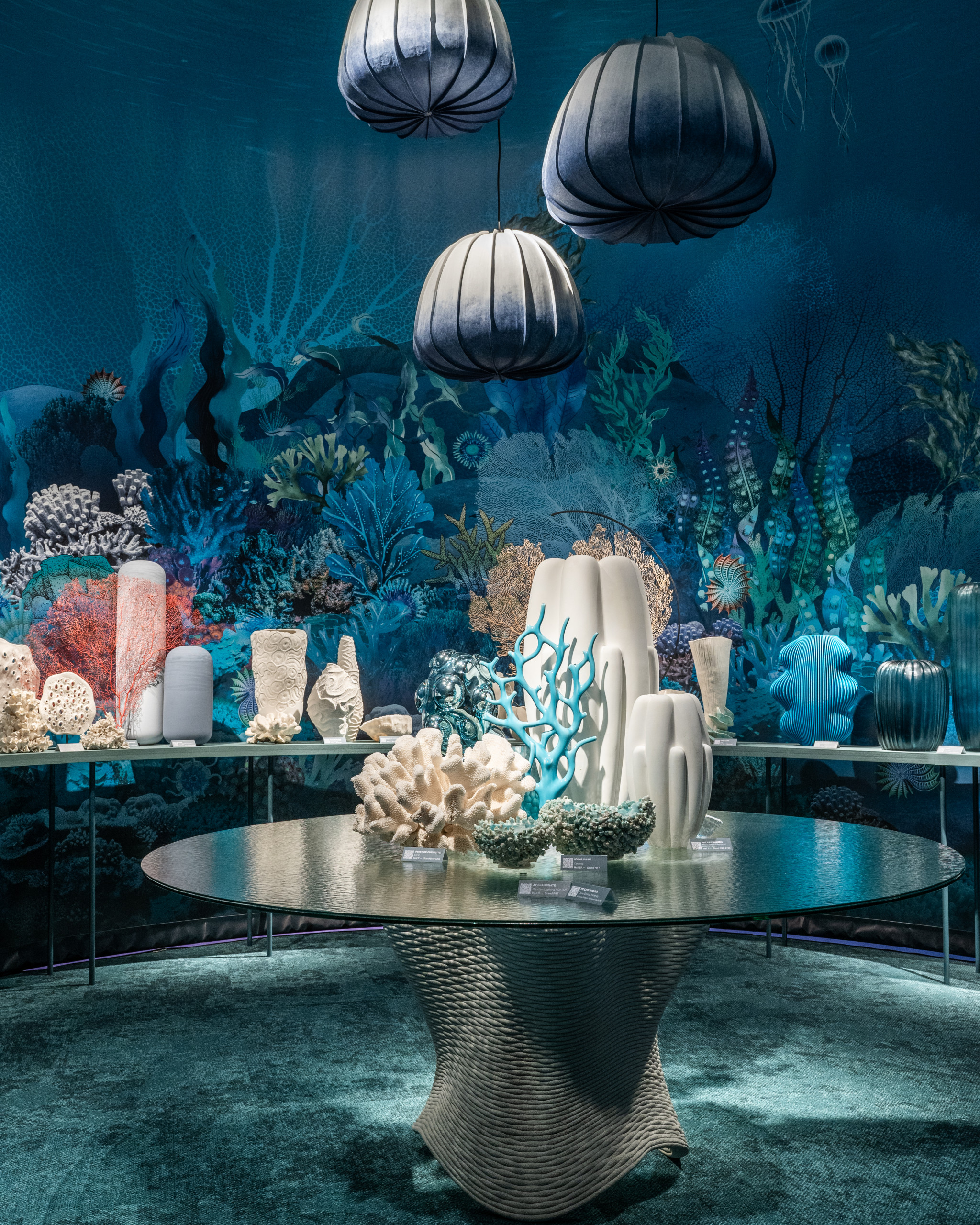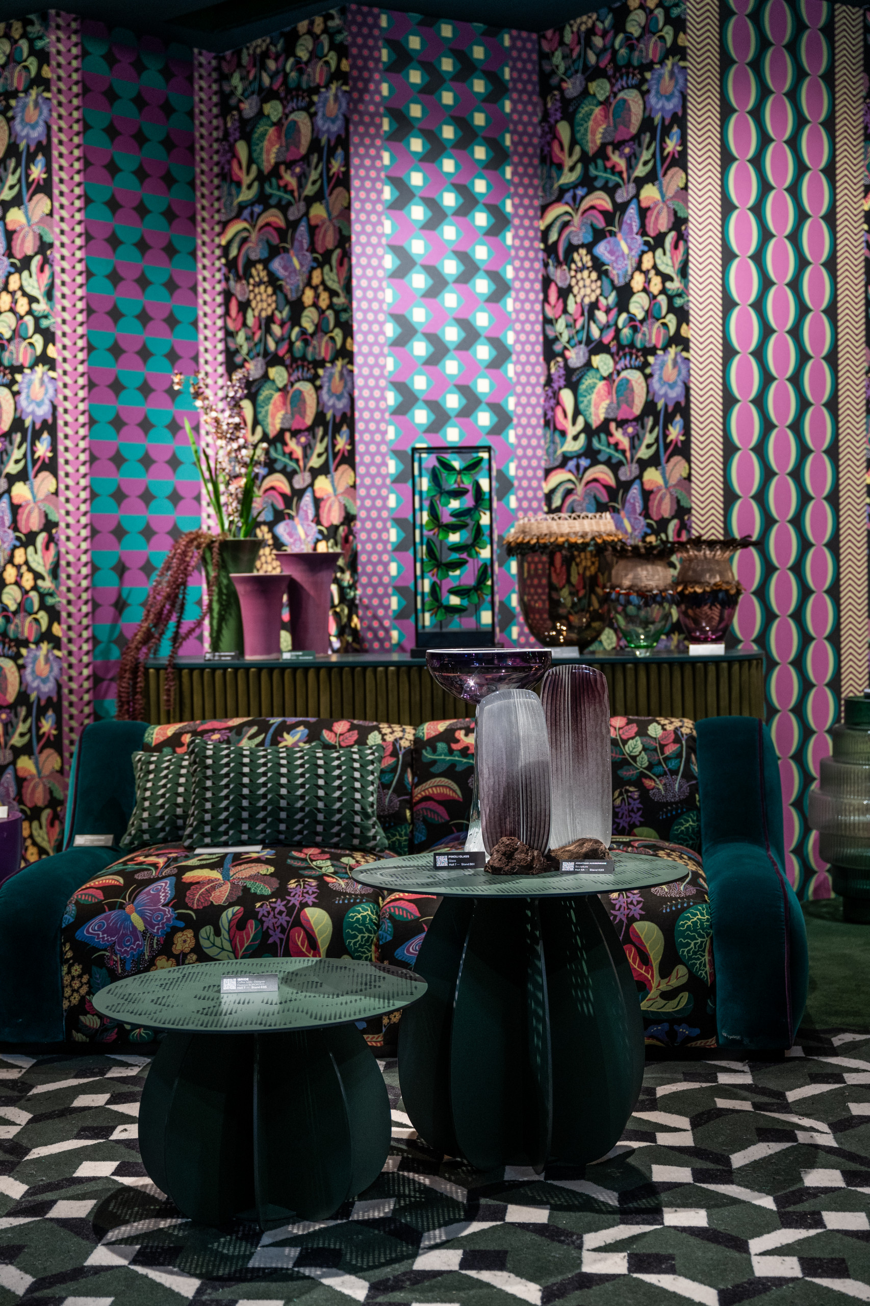 One of the displays in this installation, entitled Meta Végétal, was conceptualized to represent a luscious world of opulent beauty with a multitude of contrasting shapes, motifs and shimmering tones. Botanical and floral patterns were mixed among clean geometric lines to create a hypnotic universe based on rich greens: another color trend that stood out at the fair.