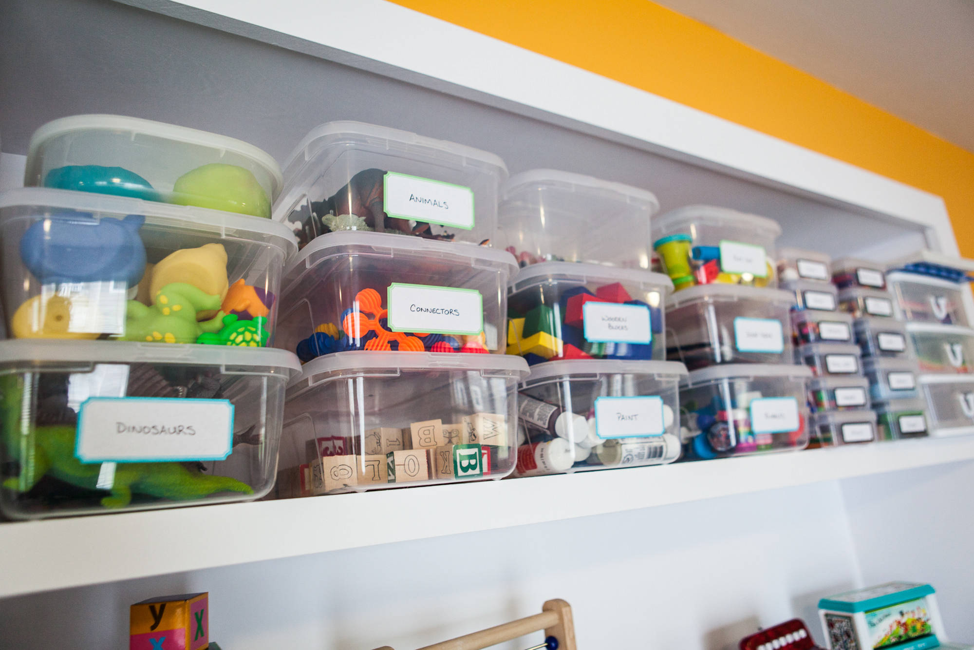 - Rotate toys. Having too many toys out at once makes clean-up more difficult and can overwhelm children. Pack up some of the toys and move them to a high shelf or a closet in another room, and swap some in every few weeks or when you notice your children getting bored with the current offerings. It always amazes me how excited kids get about toys they haven’t seen in a while.