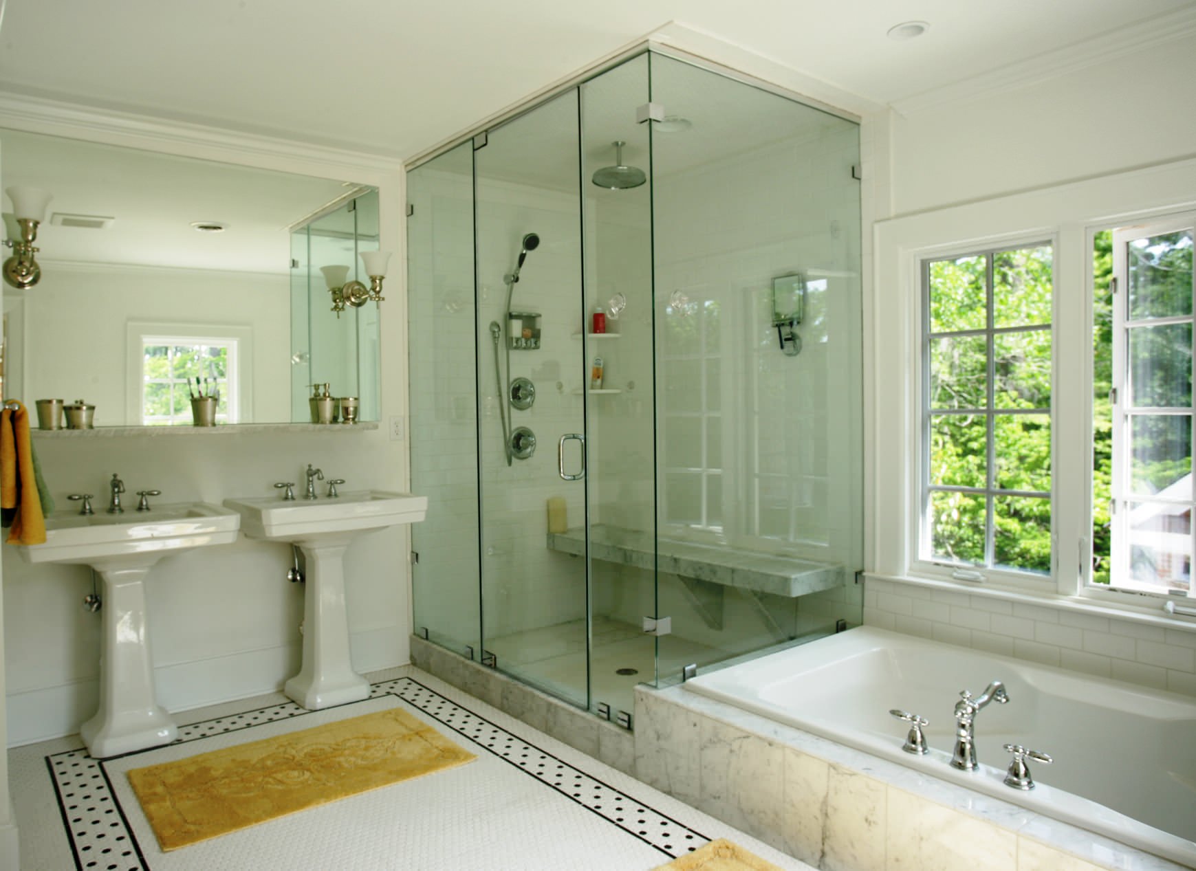 1. Built-in bench. This is a trade term describing a seat that is framed into the shower wall and floor. This type of seating can run the entire width of a shower enclosure, like the one shown here, or may be limited to a corner. It can have squared angles or be semicircular.