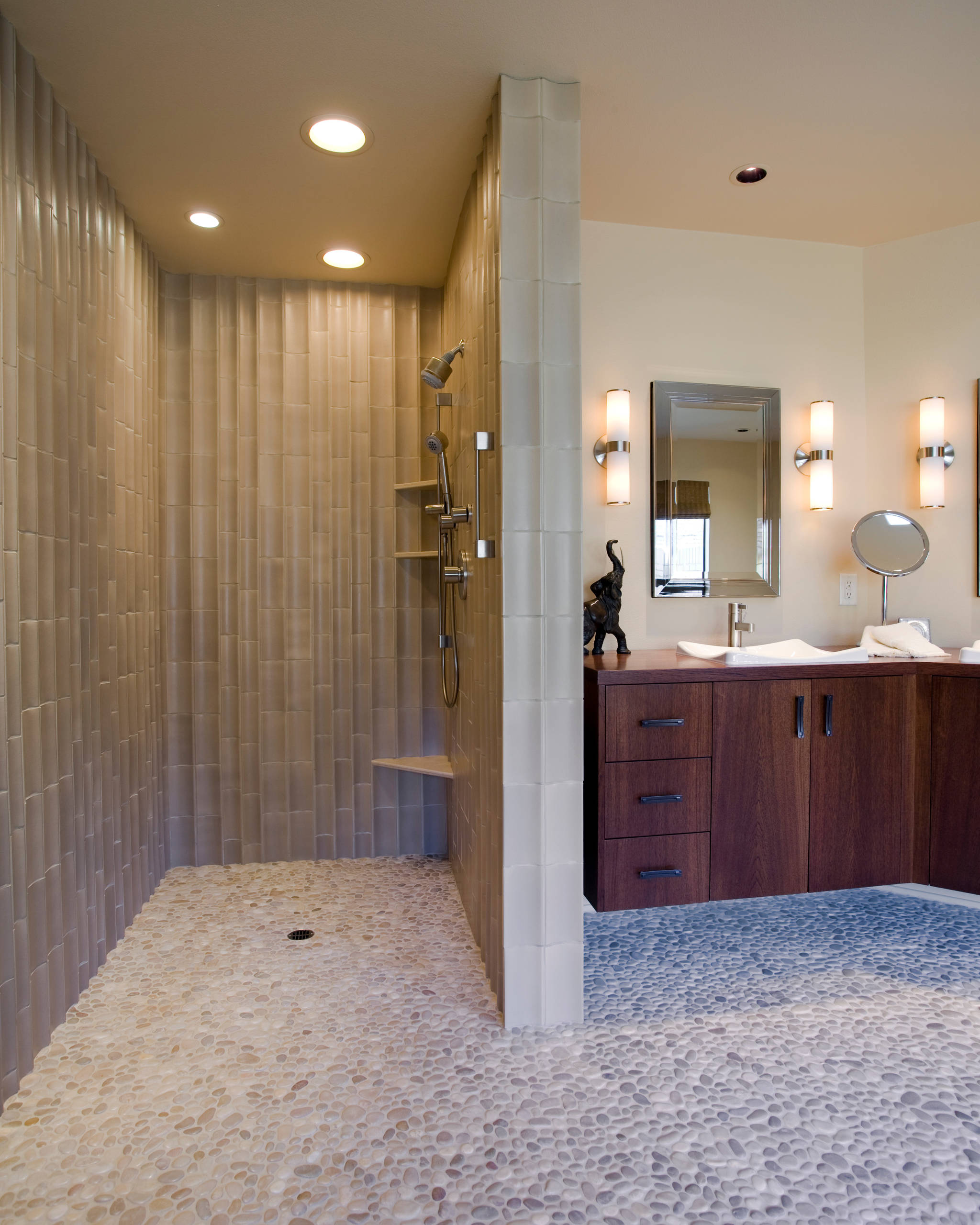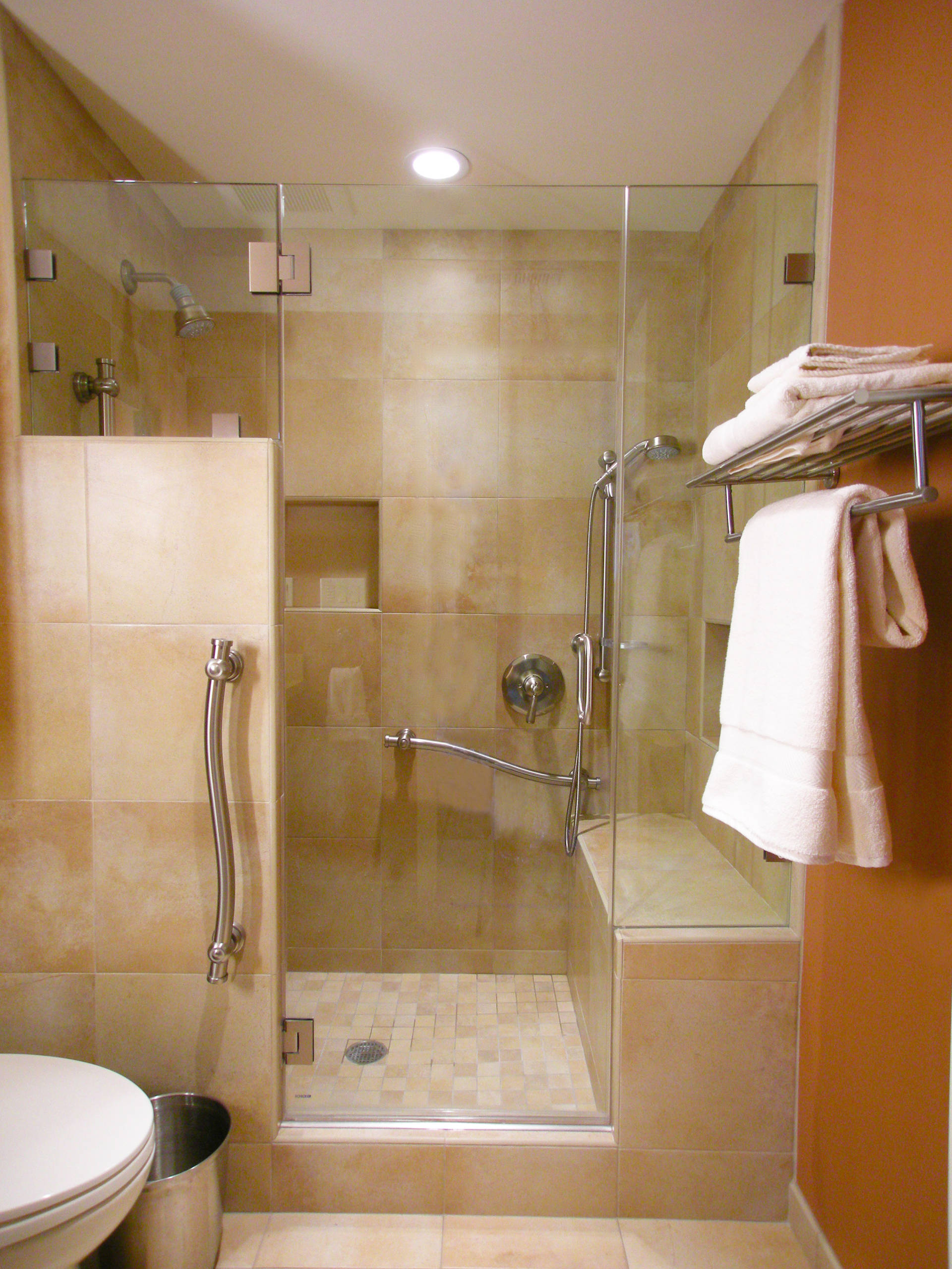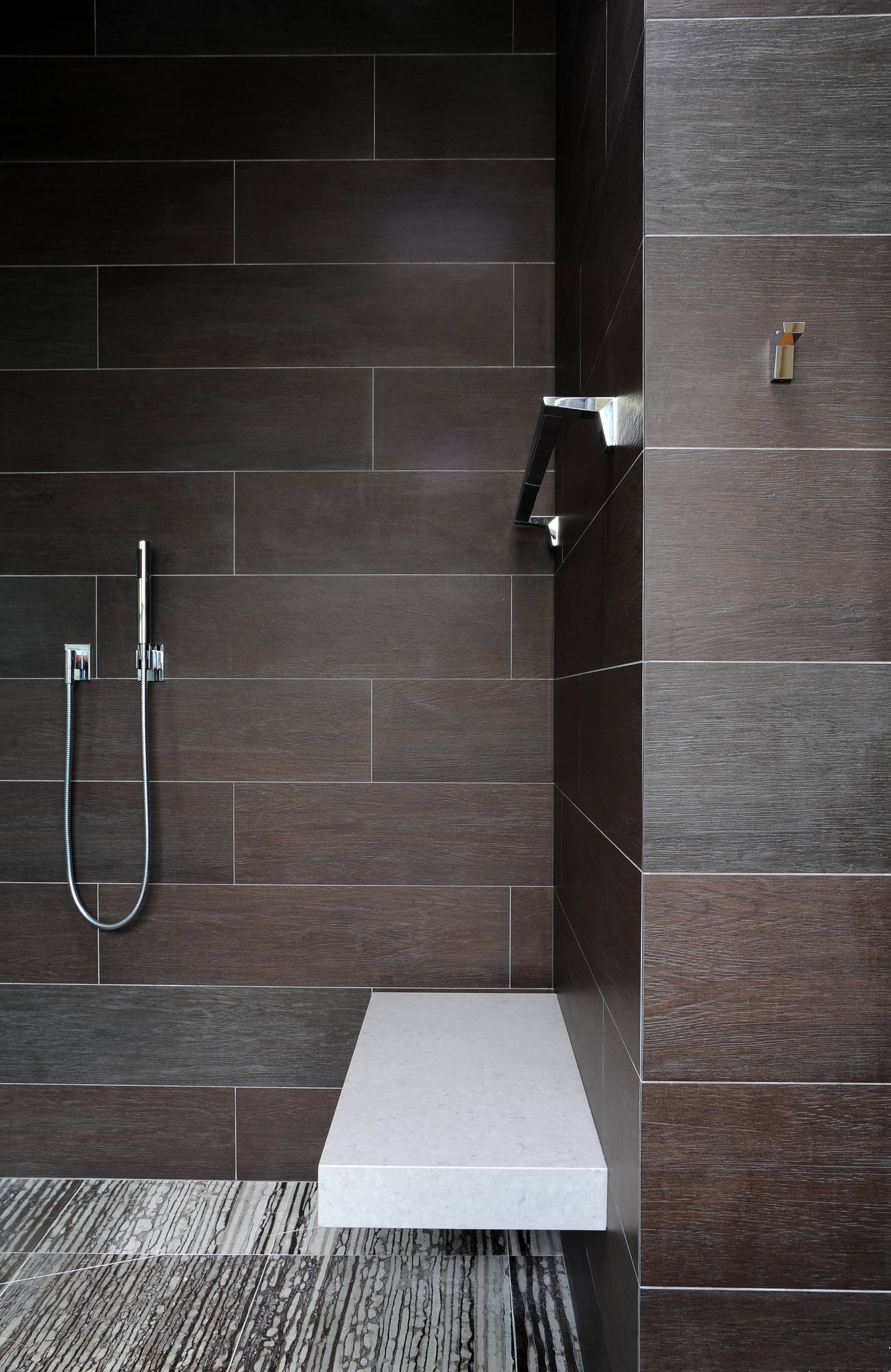 A bench alternative. Not all showers are as large and as lavish as some we’ve seen here. Nor might they be large enough to accommodate a bench sized for an actual tush. If that’s your scenario, don’t despair. Wilkins suggests adding what she calls a toe grip. This is a small recess in the shower wall or a triangle of tile in the corner that takes up very little space, but still helps with shaving legs and washing toes.