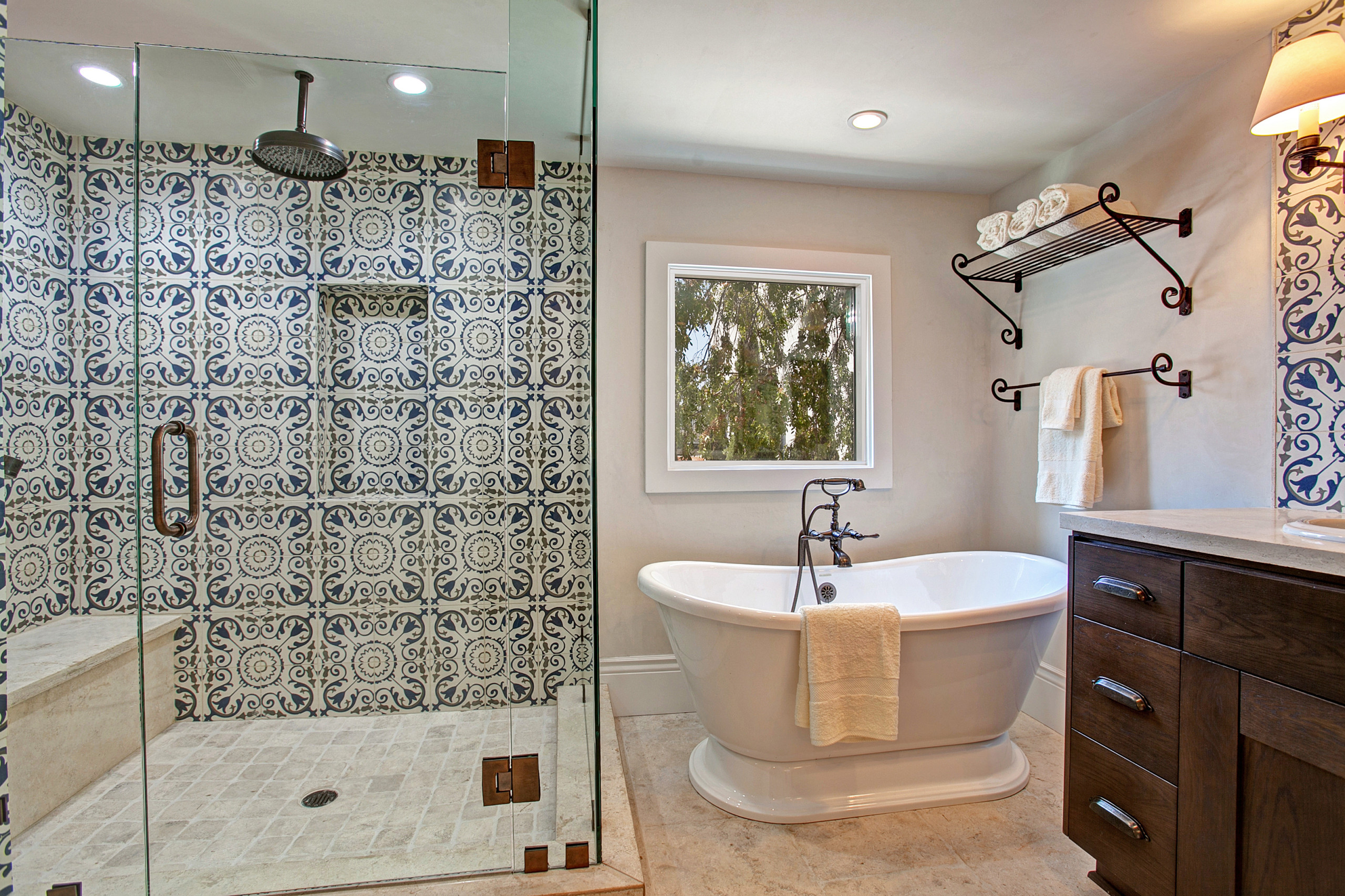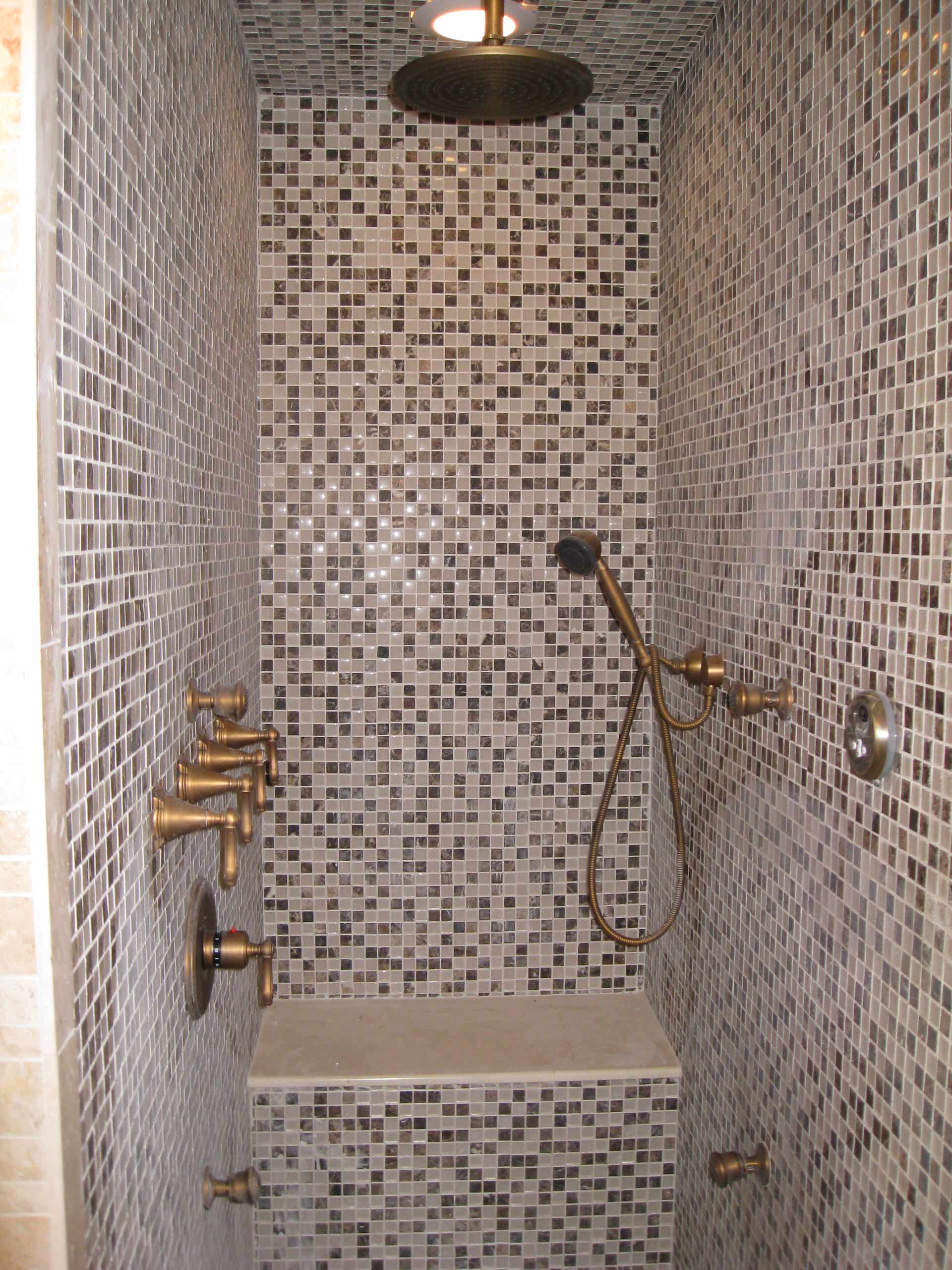 This built-in bench by SoCal Contractor was created for a fashion industry executive who travels most of the year. The custom love seat re-creates the spa experience the owner loves at the boutique hotels she frequents. The tiled, ergonomic design features a sloping seat and a recessed channel that drains behind the “cushions” so water can’t puddle.