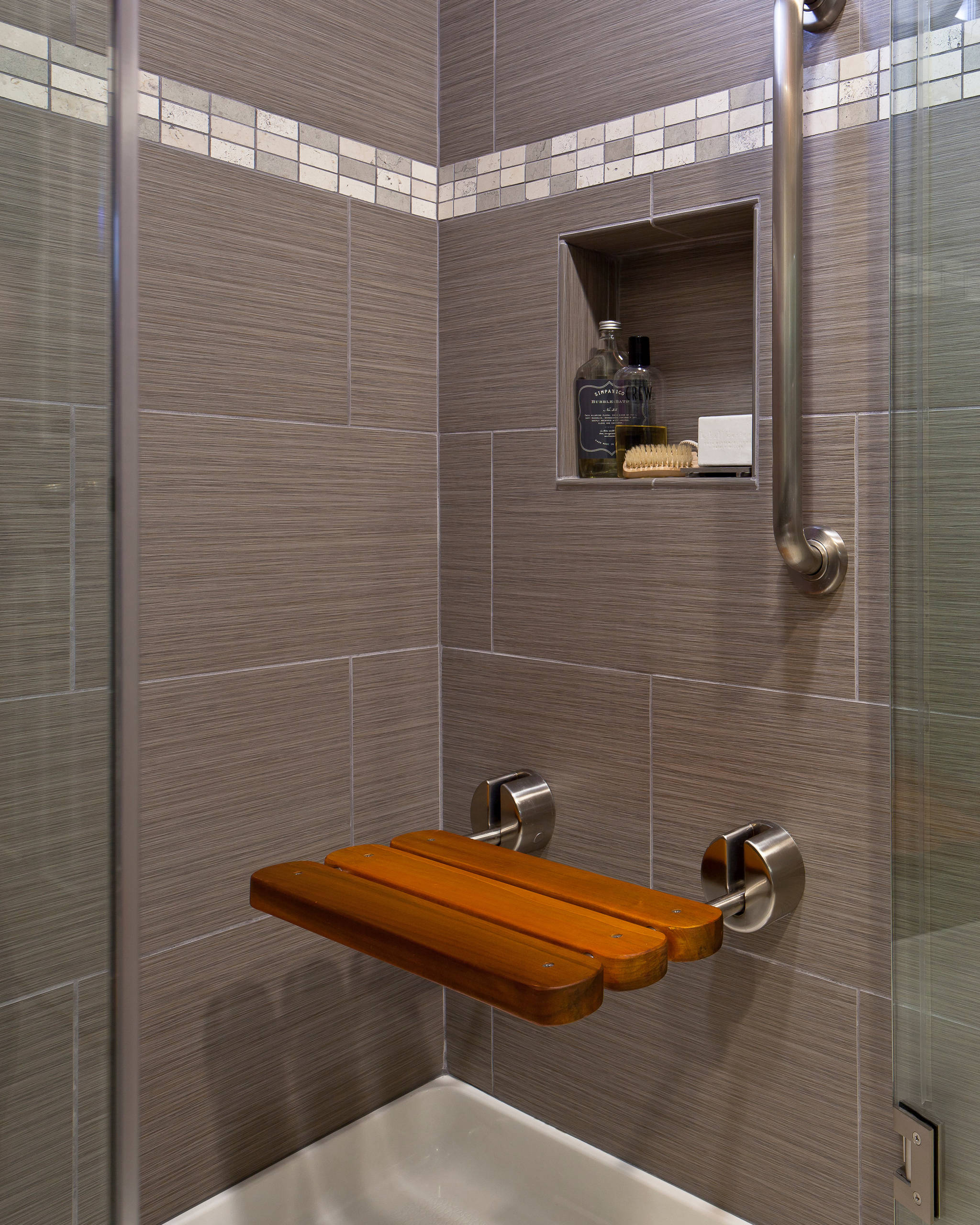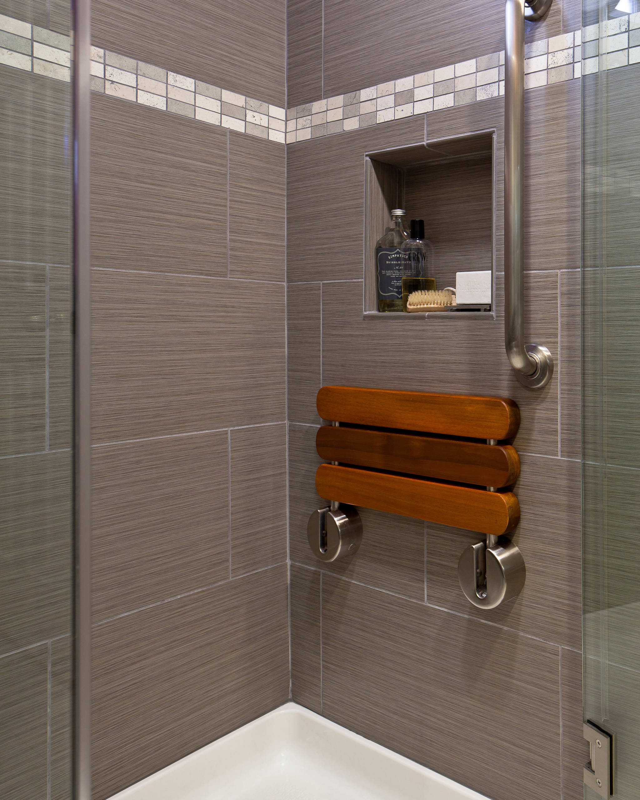 3. Fold-down bench. This is a space-saving solution for smaller showers or universal design showers. Wilkins’ company installed this fold-down bench by framing in special blocking between the stud walls.