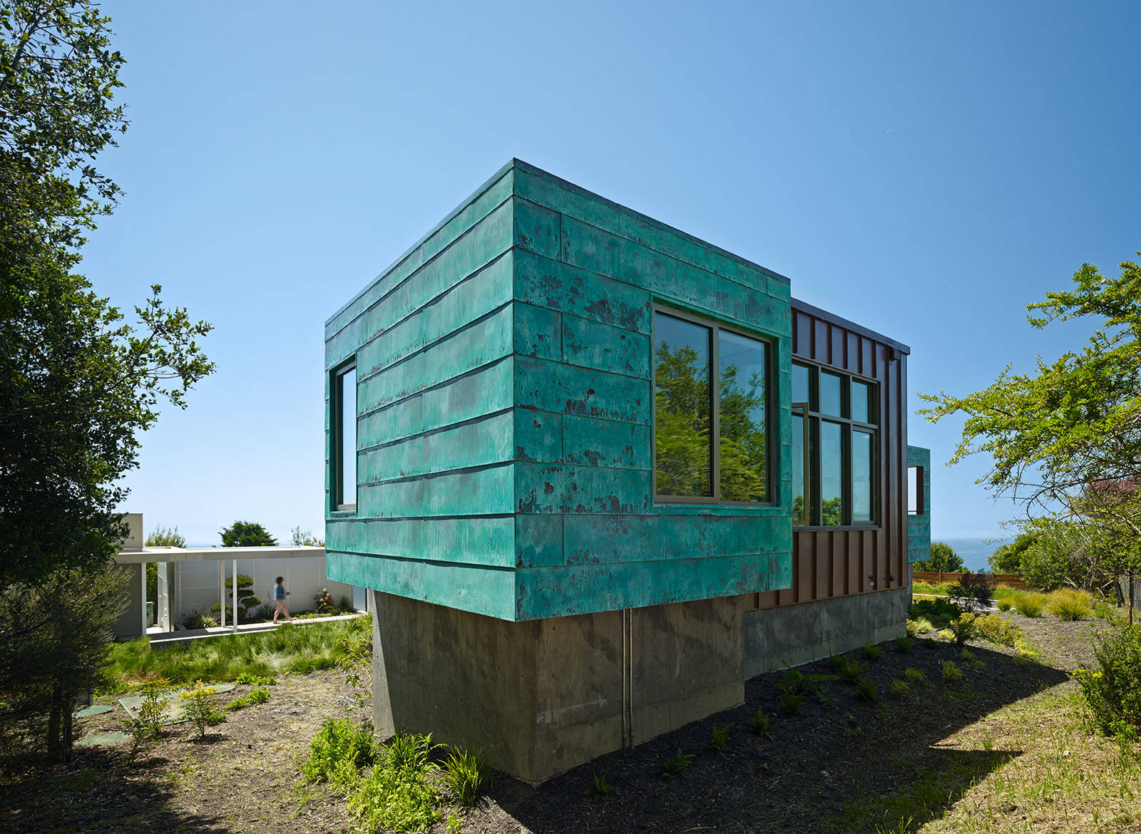 What looks fairly even from a distance is actually mottled up close. When materials like copper gain their patina naturally, the speed at which it happens will depend on orientation, climate and other factors. A soffit, for example, will take much longer to turn green than a roof or facade.