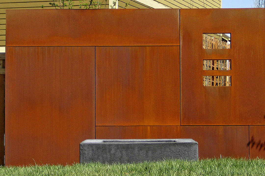 Patinated steel often goes by the trade name Cor-Ten; the material is coated with a layer of rust through weathering. The application is popular in modern buildings and landscapes. One needs to be aware that the rust can bleed onto adjacent surfaces, such as concrete sidewalks below a weathered steel wall.