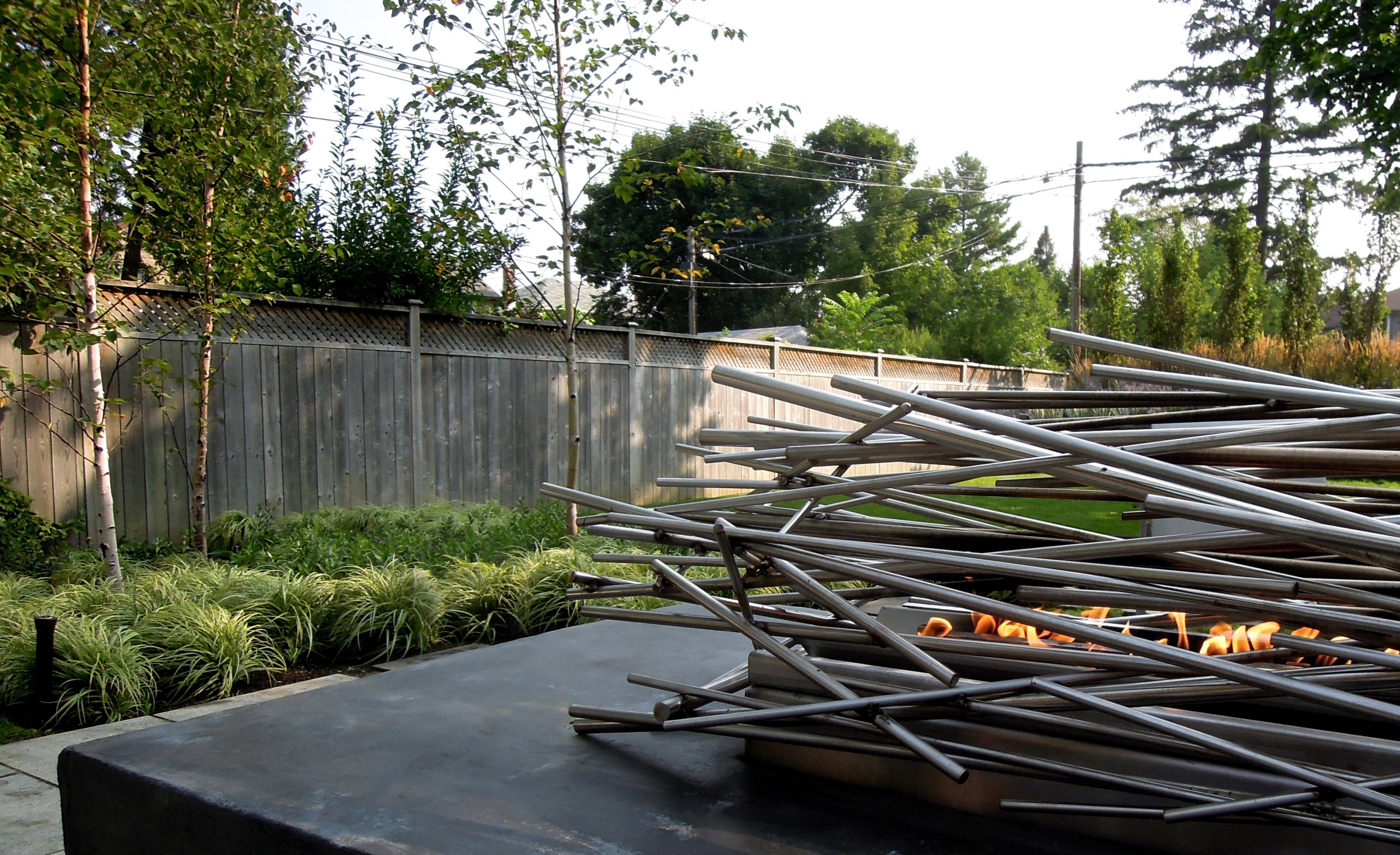 The fire pit contains a sculptural bundle of stainless steel rods inspired by branches. The stainless steel doesn’t get hot enough to be a safety issue when the fire is going. De Brabandere designed a tinted concrete table for the sculpture to sit atop. The table is hollowed out to contain a gas line and a burner tray that provide warmth and a cozy glow. Local company Hogtown Sheet Metal + Custom Fabrication made the sculpture.