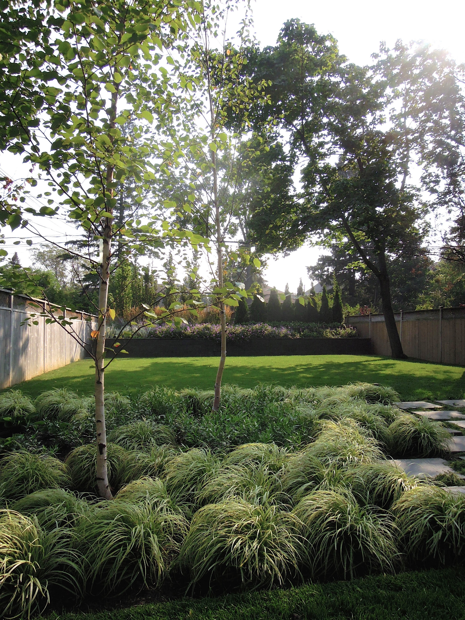 The homeowners were lucky to have some existing mature maple trees and a cedar along the right side of the yard. De Brabandere balanced the mature trees on the right with the birches on the left. As the trees fill in, they will block views of and provide privacy from neighboring houses.