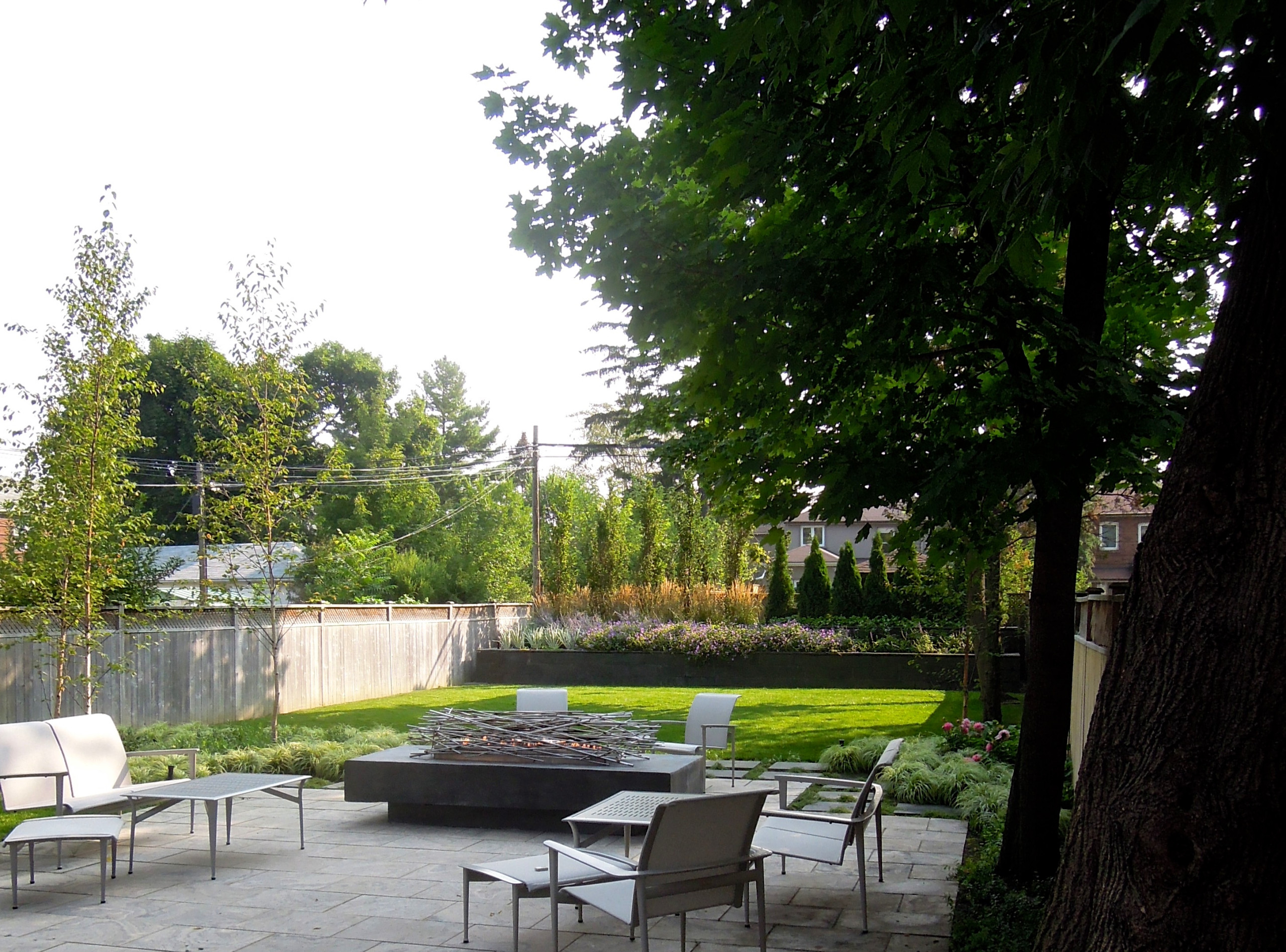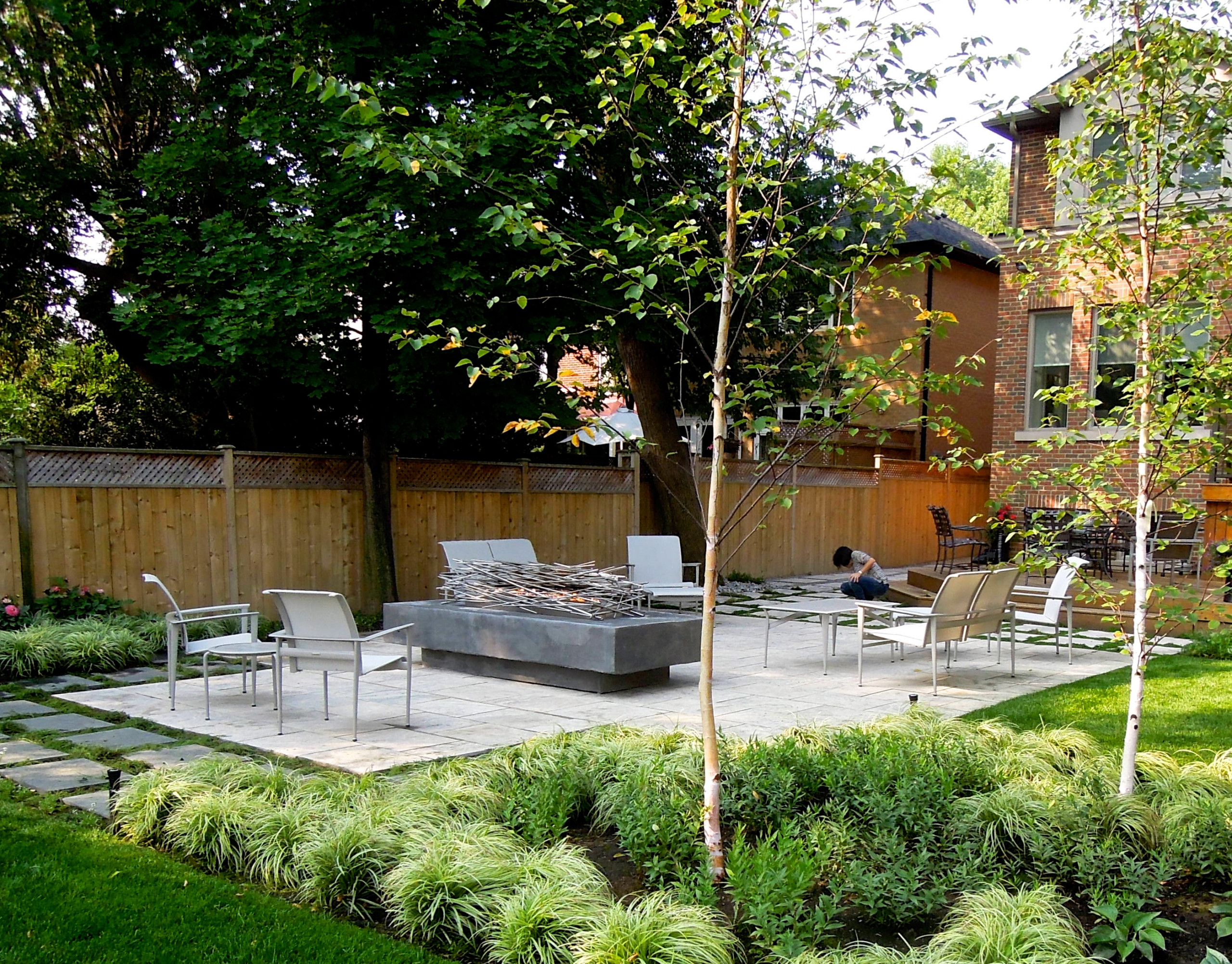 The design includes a new entertainment patio with a large, sculptural fire pit; a cluster of birch trees; new garden beds; and two layers of raised beds along the back of the yard that screen views of the yard and shed behind them. The designer also left space in some of the beds where her client could enjoy gardening — there is a bed to the right of the patio and another between the patio and the deck.
