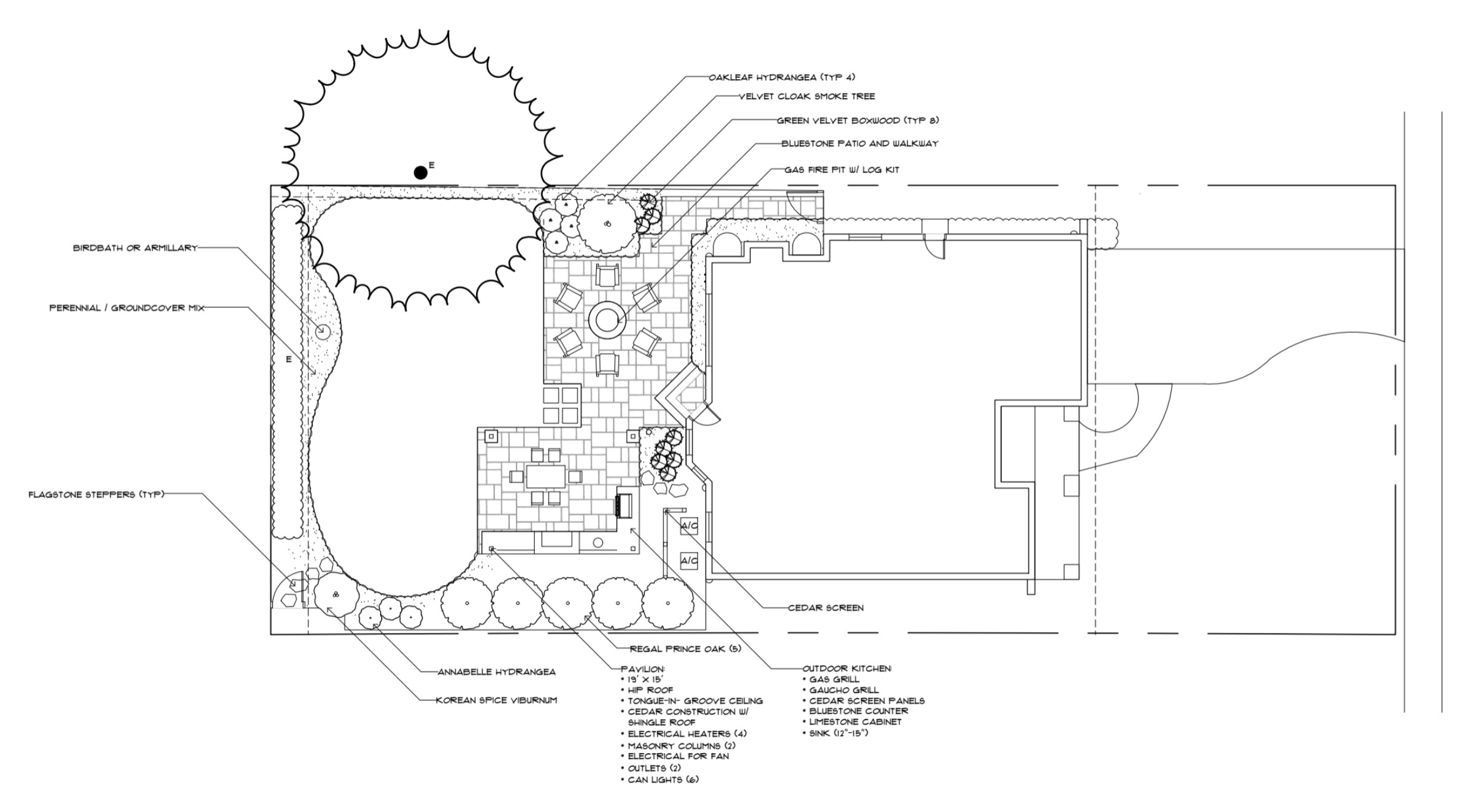 Site plan: The fire pit lounge is on the left and the pavilion is on the right. One thing to note is that local codes dictated that a fire pit with a gas line be at least 15 feet from the house.