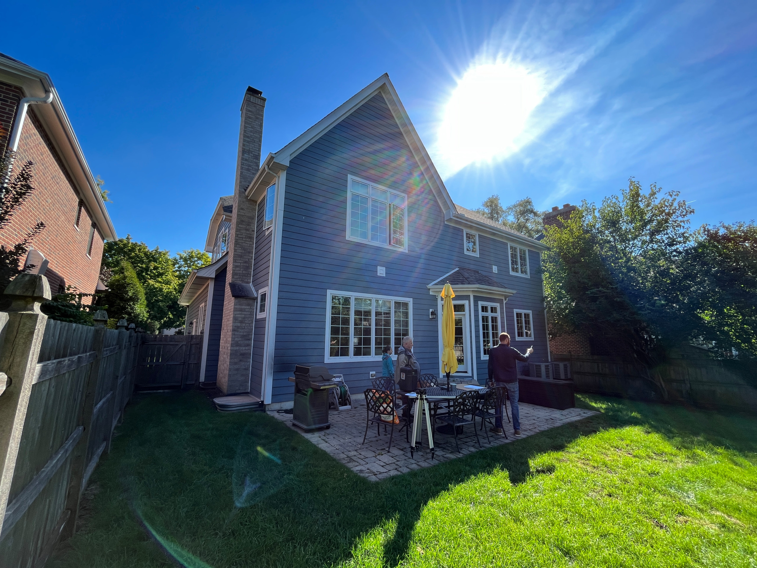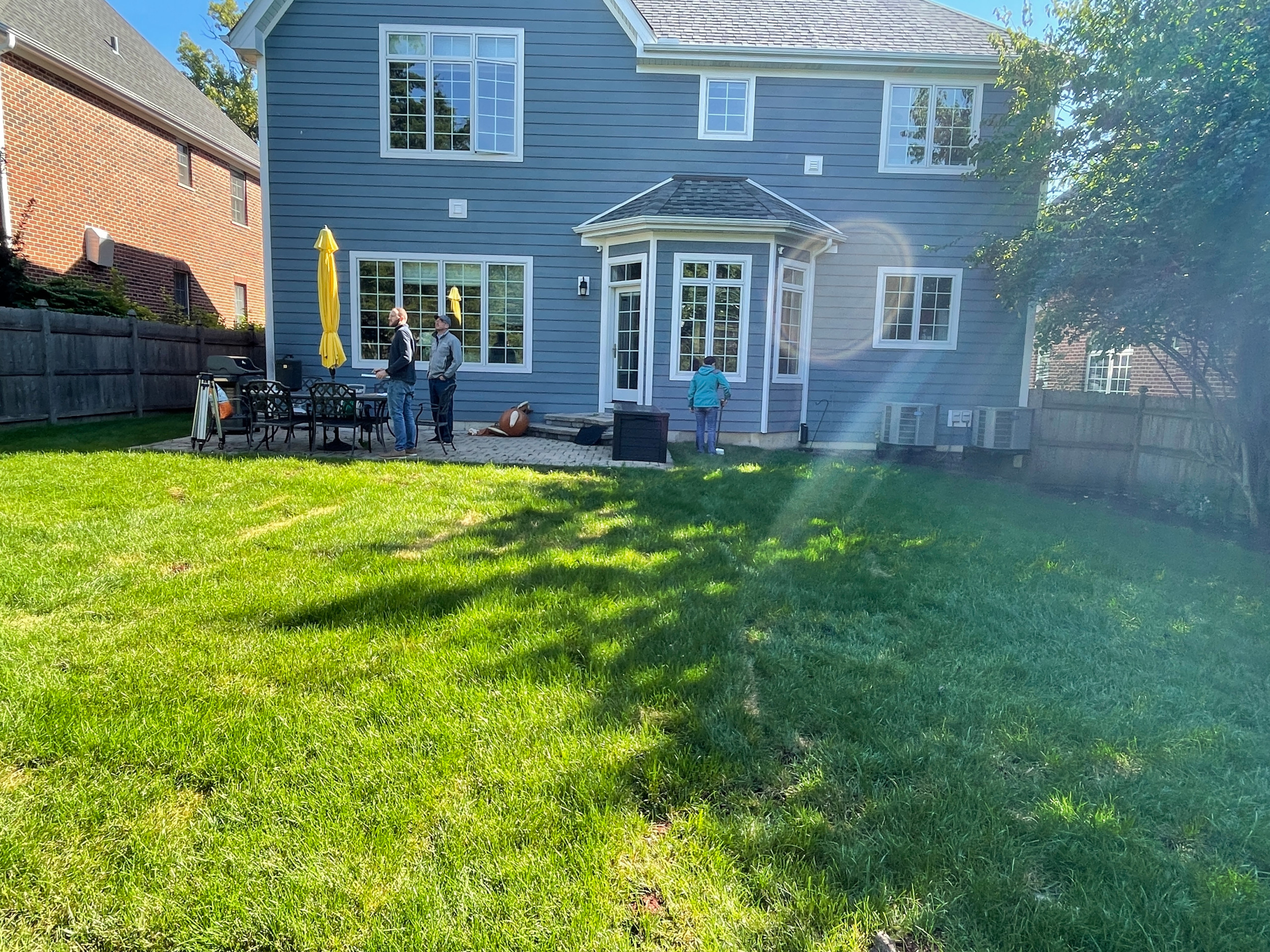 After: The new full-range, natural cleft bluestone patio is 500 square feet, including the portion under the pavilion. This material plays nicely off the blue siding on the house. The new pavilion is 19 by 15 feet, providing 285 square feet of covered space for an outdoor kitchen and dining area.