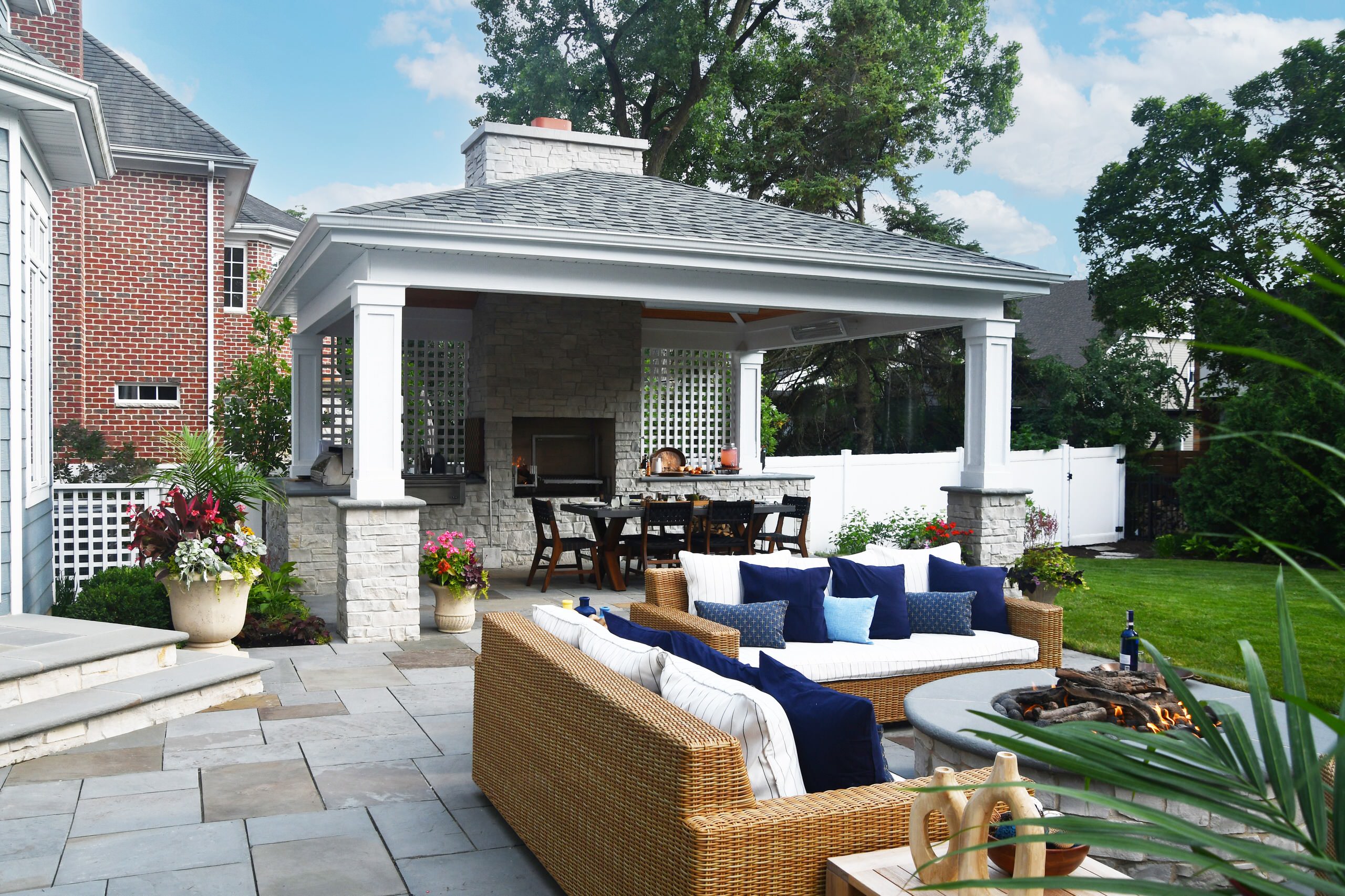 Algozzini used a combination of lattice screens and a line of columnar Regal Prince oak trees (Quercus x warei ‘Long‘, USDA zones 4 to 9; find your zone) planted behind the pavilion to create privacy. Nods to the home’s architecture include matching the white paint to the trim on the house and using the same stone that’s on the home’s front facade. The stone, seen here on the fireplace and columns, is Wisconsin limestone.