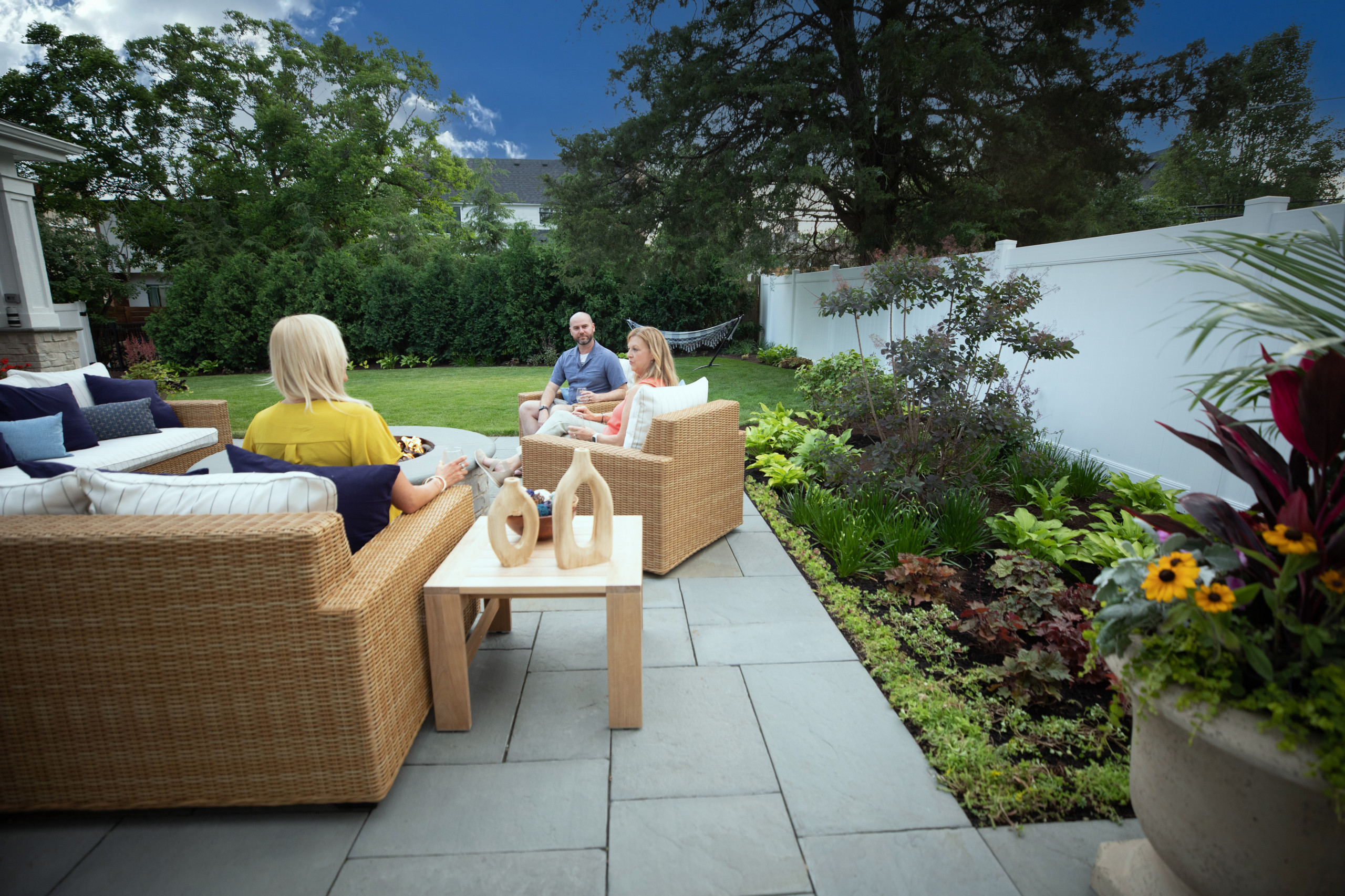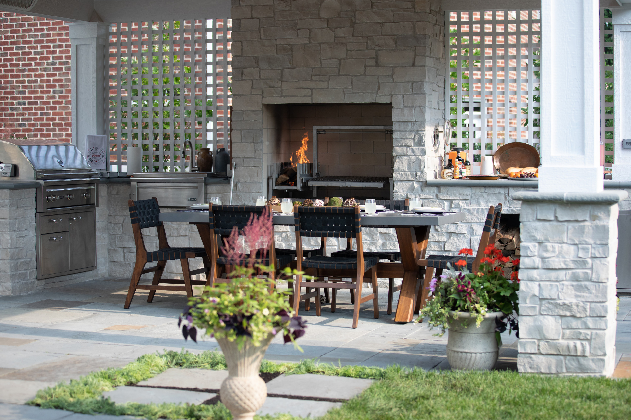 After: The bluestone extends from under the pavilion out to the new lounge area. “This provides a great spot for everyone to gather around the fire pit and visit after the meal,” Algozzini says.