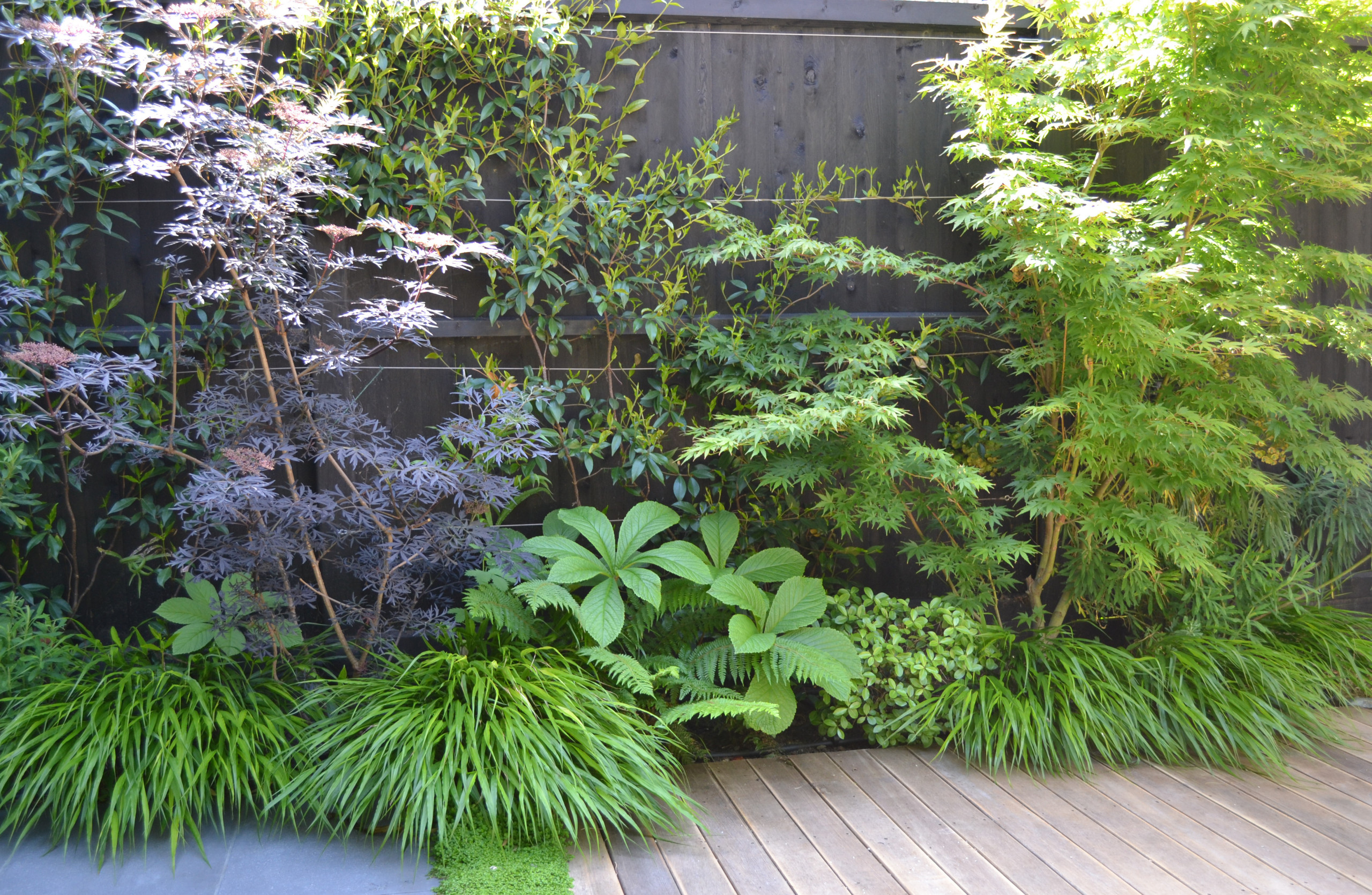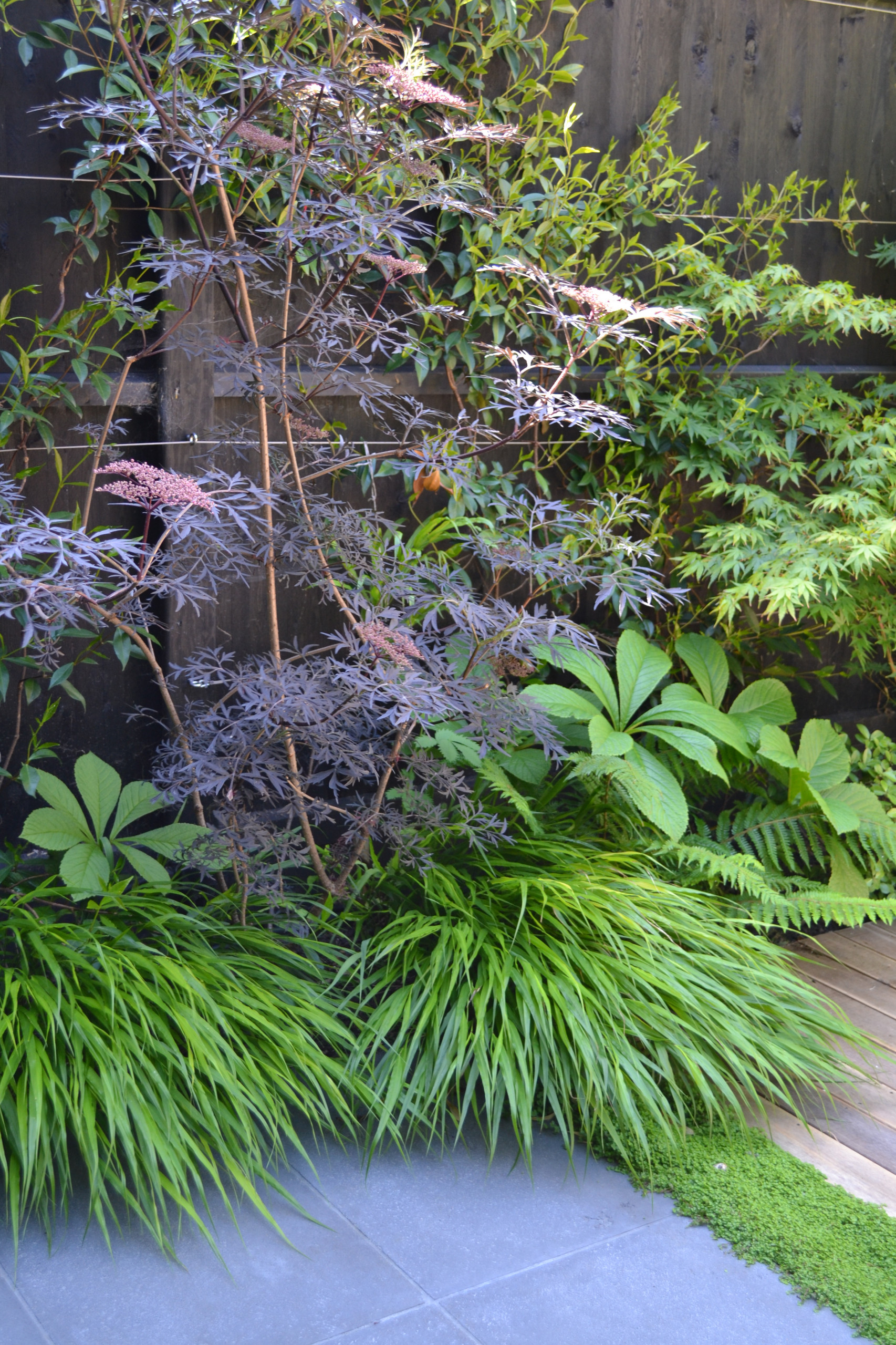 Also along one side of the yard is a Japanese maple (Acer palmatum, zones 5 to 8), seen on the right here. “It’s a really good garden feature tree,” Duffy says. “They give a nice canopy and it fits well with the theme of the planting, which has lots of tones and textures.” A purple elderberry (Sambucus sp.) grows on the left. “These get big as well,” he says.