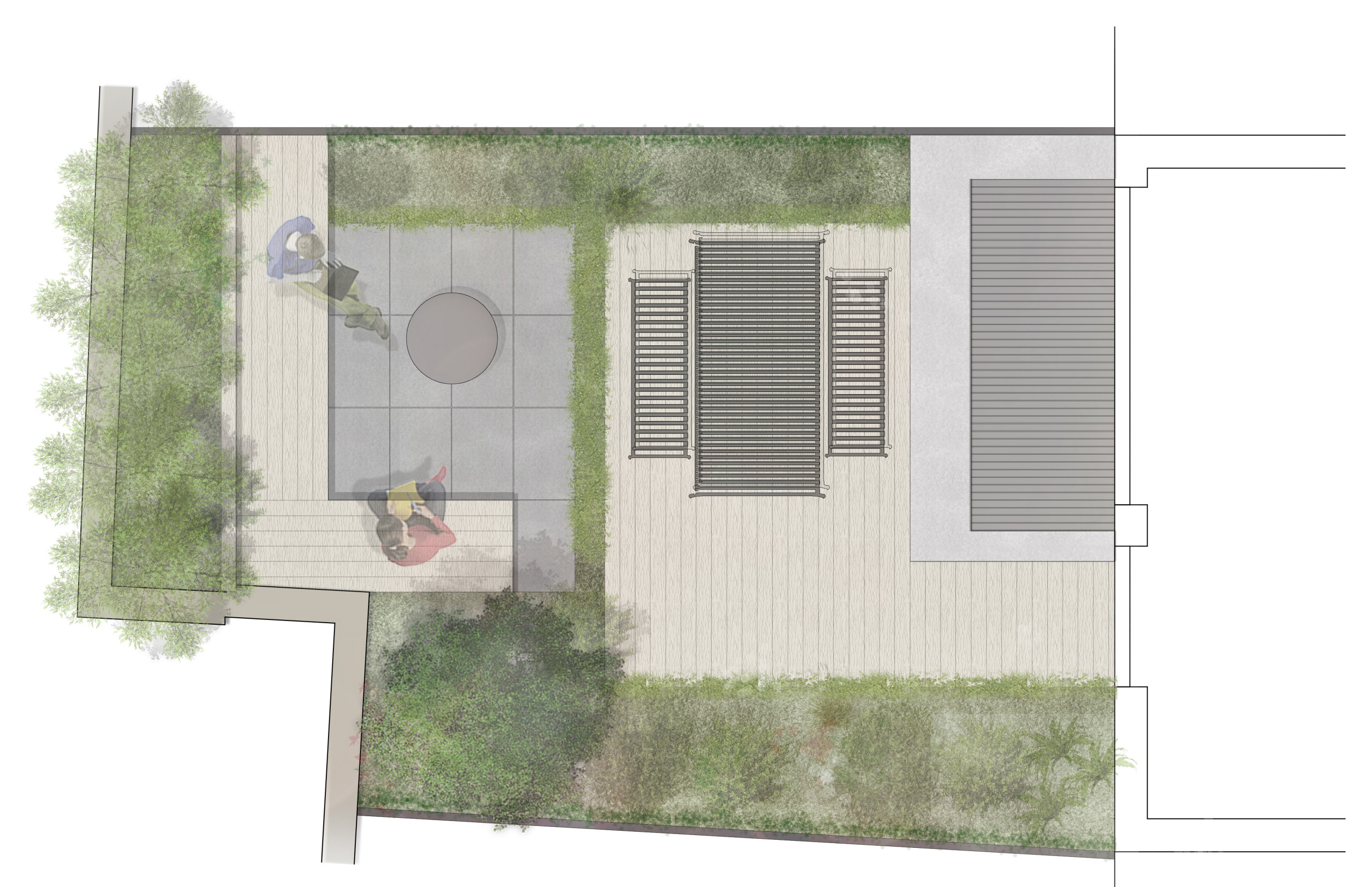 This plan of the backyard shows the zones clearly. Duffy has added a dining table to show how it would fit in.