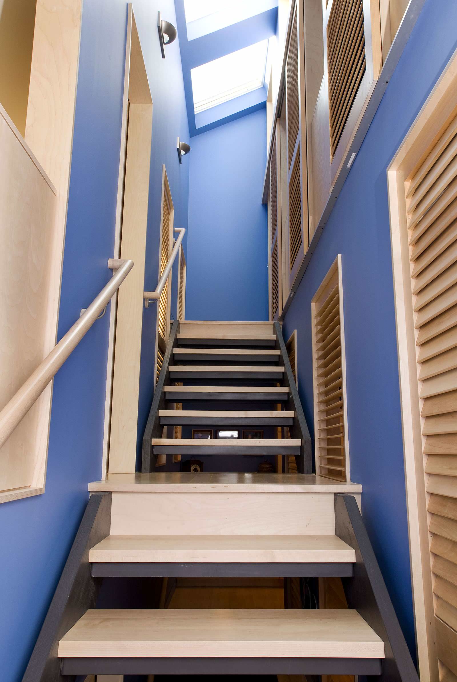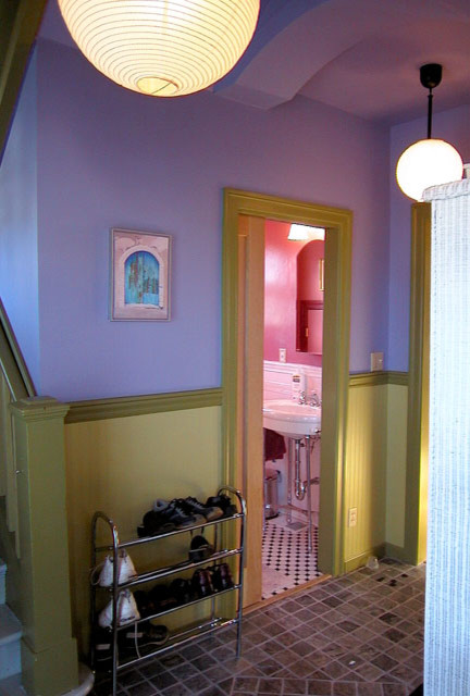 Wainscoting is a great architectural detail that can be easily emphasized. A great solution is painting the wall a contrasting color to that of the wainscoting, like this periwinkle against the green. Painting the molding a slightly darker shade adds a great punctuation to the detailing.