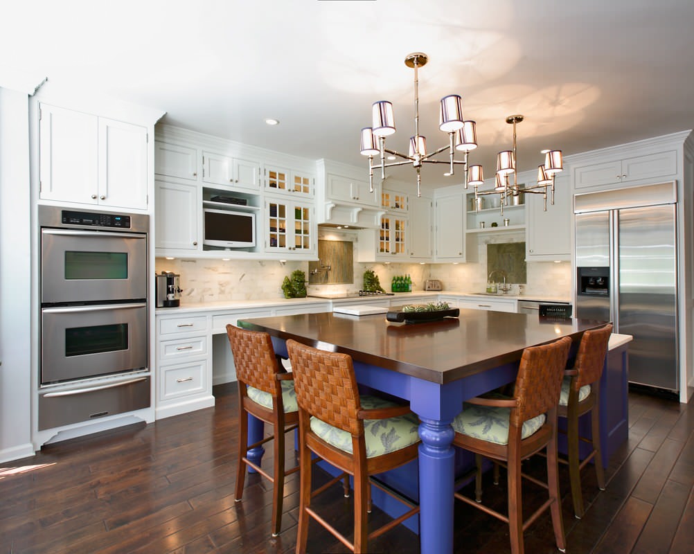 Introducing periwinkle as the pop of color every kitchen never knew it needed! I love that the designer chose to paint the base of this seating area and island in this flavorful color. It adds a little zest to the space and really sets off the richness of the wood floor.