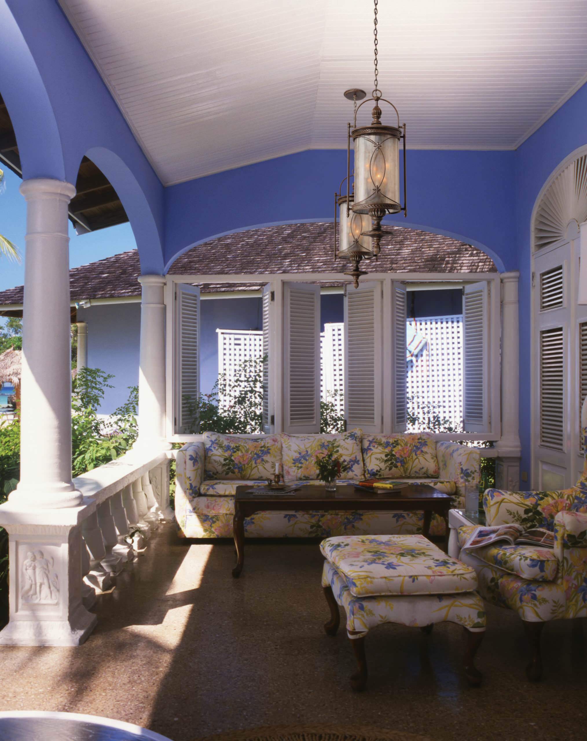 By painting the inside of this porch a more blue-hued periwinkle, the space both mimics the sky and adds some personality. Plus, it picks up the same periwinkle shade found in the floral pattern on the furniture.