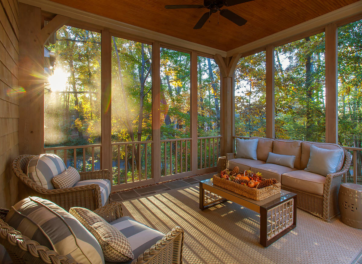If your porch doubles as an outdoor seating area (and your climate allows), you can extend your enjoyment of the space into the cool season. Draw inspiration from this inviting Montana porch and add lanterns, flameless candles or twinkling string lights, pile up warm blankets and pick up a few new fuzzy throw pillows for the season.