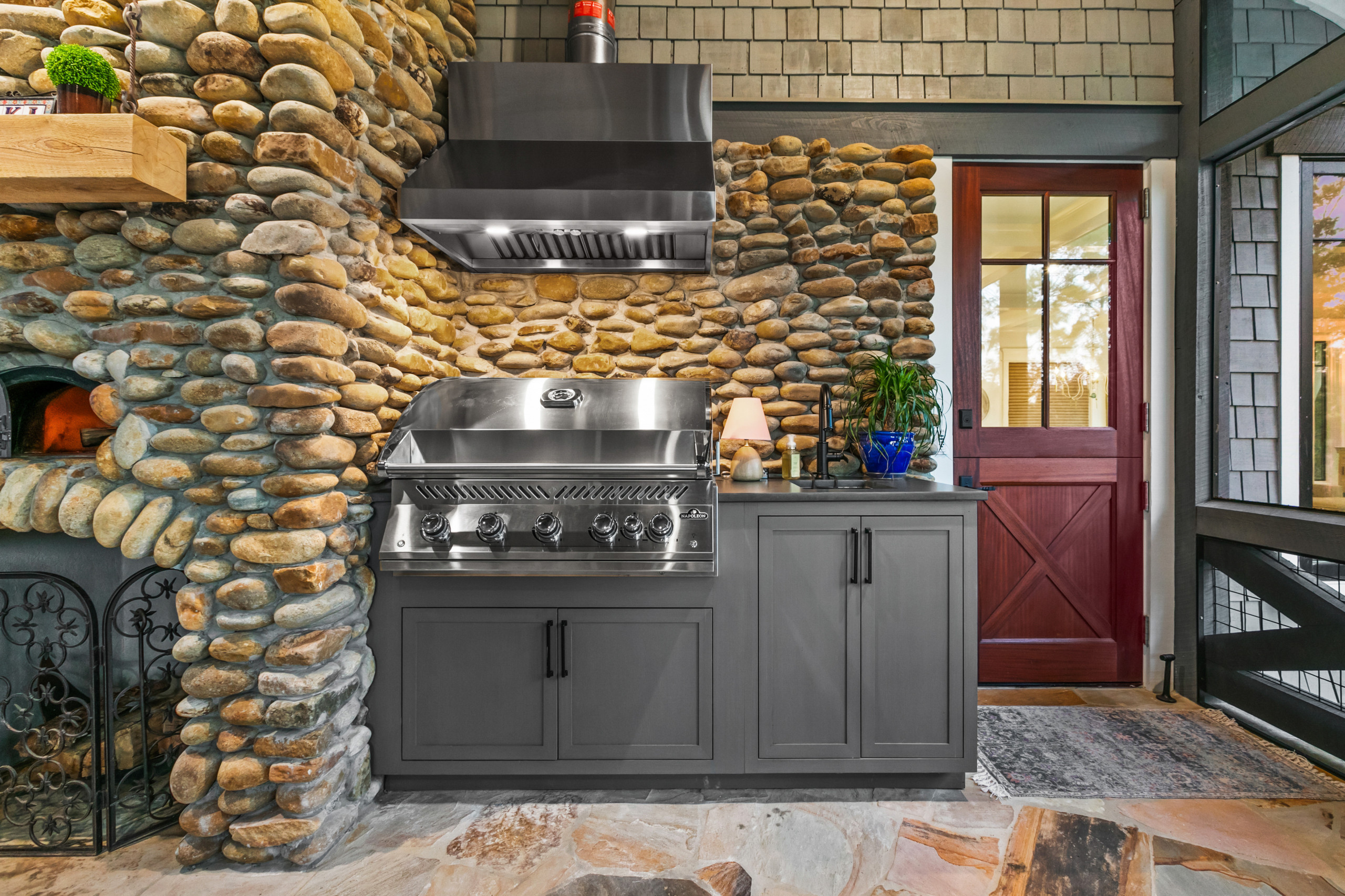 The architect continued the river rocks from the chimney to the wall behind the grilling area, lending a cohesive look. “We needed some sort of masonry behind the grill to protect the wall,” he says.