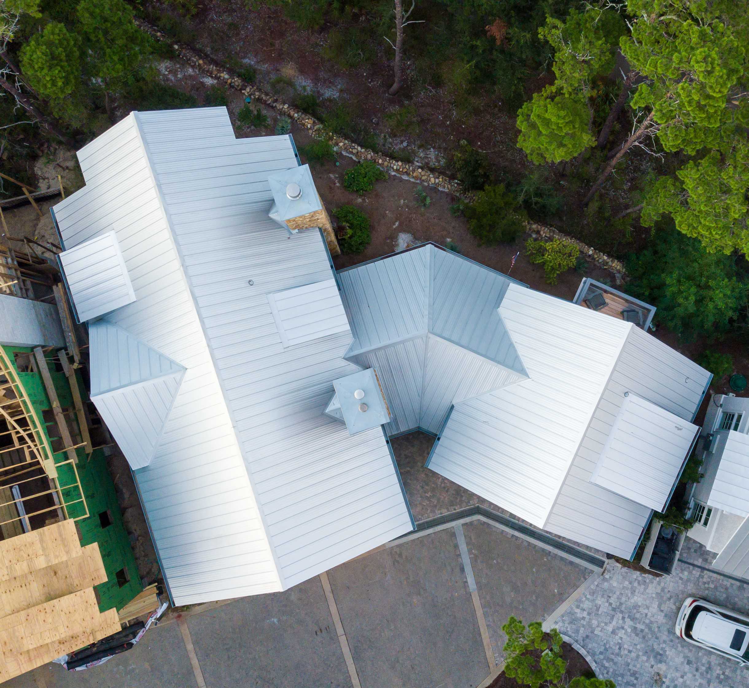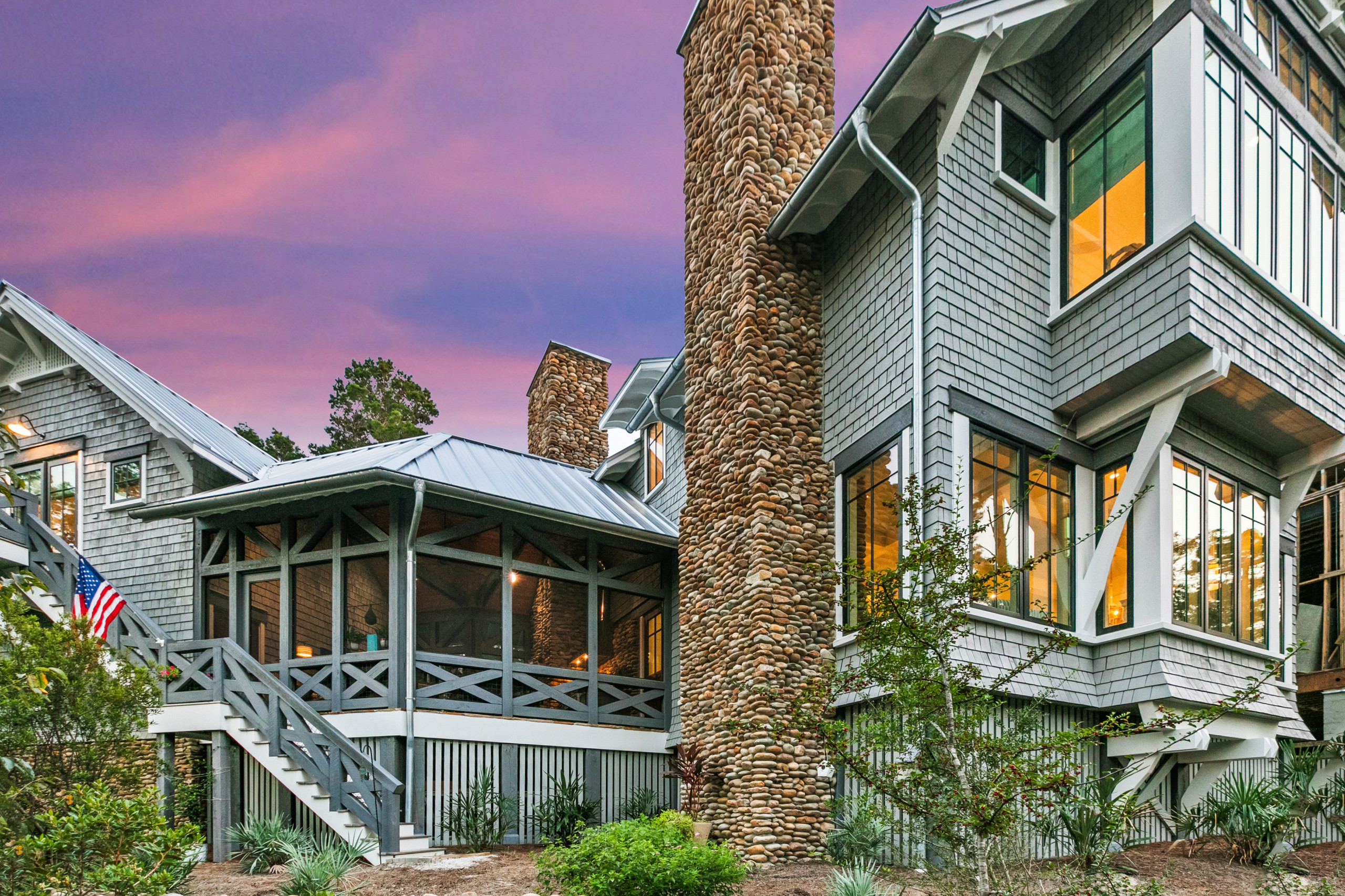 Here’s an overhead look, showing how the porch connects the main home to the carriage house. A retaining wall of round river rock that matches that of the chimneys appears above the house in this photo. Retaining walls run throughout the neighborhood to prevent stormwater runoff from reaching the delicate ecosystem of the dune lake that connects to the Gulf of Mexico.