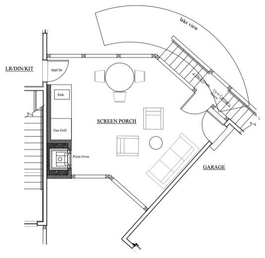 This end of the porch is the seating lounge. “When I’m drawing up plans, I always make sure to draw in the furniture to make sure everything will fit properly. I also made sure there was enough room to move around and work in the kitchen,” Martin says. “In this case, I made the porch as large as it needed to be and not any bigger than that.”