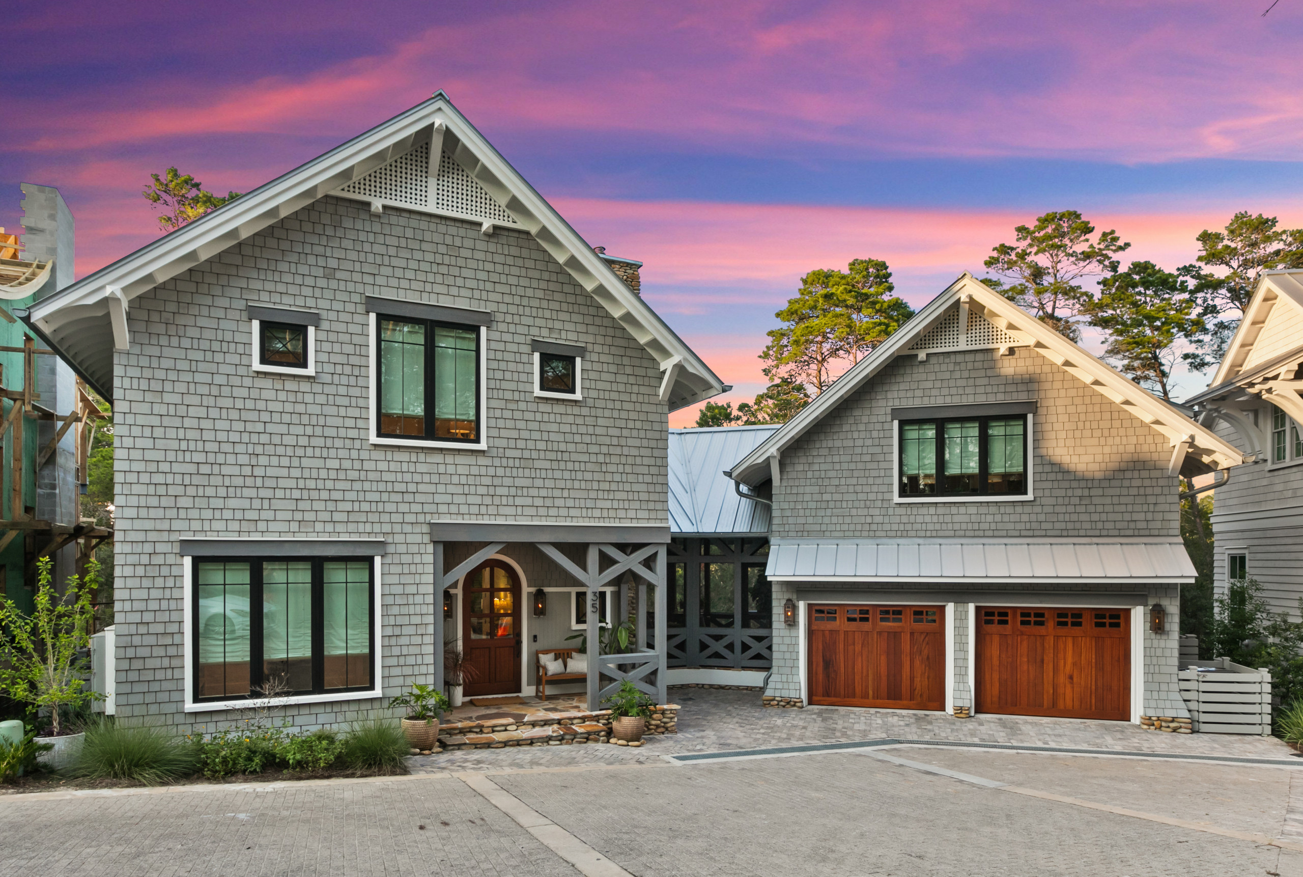 Shingle stain: Platinum Gray translucent, Benjamin Moore: trim stain: Shale semitransparent, Cabot; rafter tails and soffit paint: Extra White, Sherwin-Williams