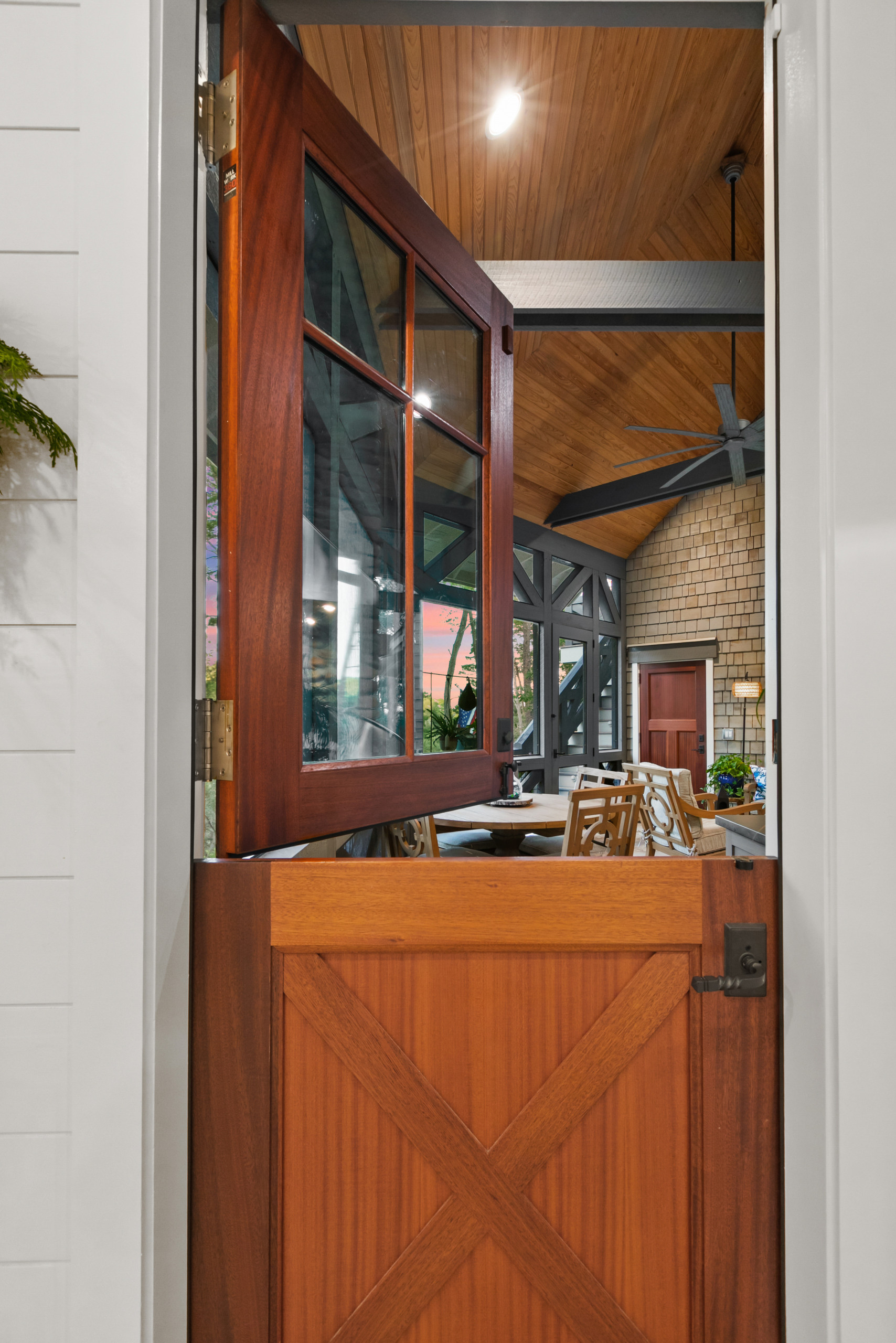 A Dutch door opens to the porch from the house; the couple can leave the top half open on cooler days. Like all the other exterior doors, this one is mahogany.