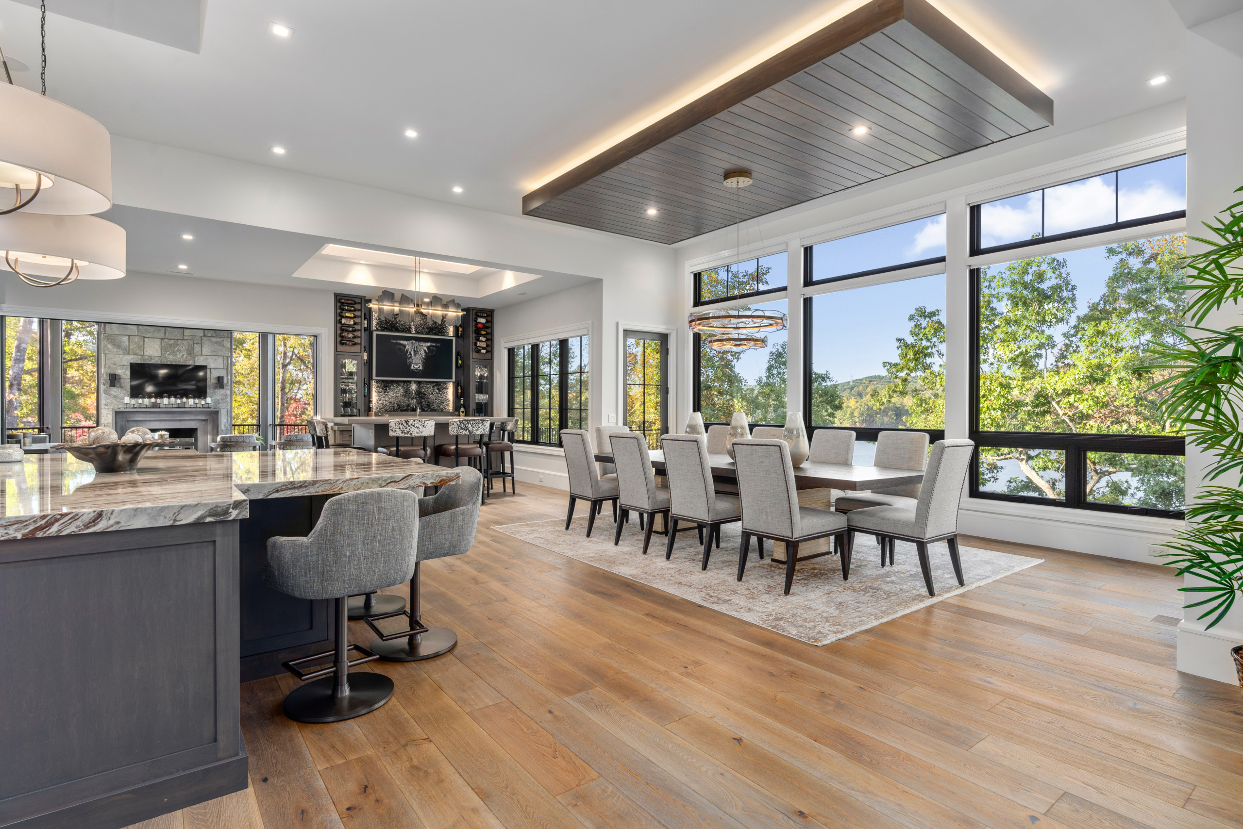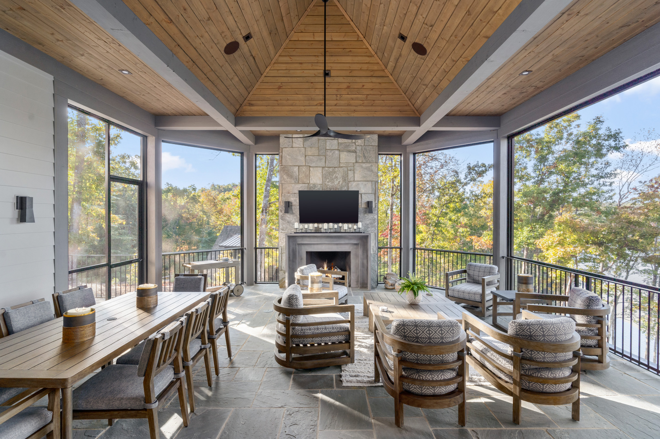 At 580 square feet, the porch is generously sized, and it has been thoughtfully scaled to accommodate a large dining table, lots of lounge seating, a fireplace, circulation and plenty of breathing room. The swivel chairs can turn toward the lake, the dining table, and the fireplace and TV.