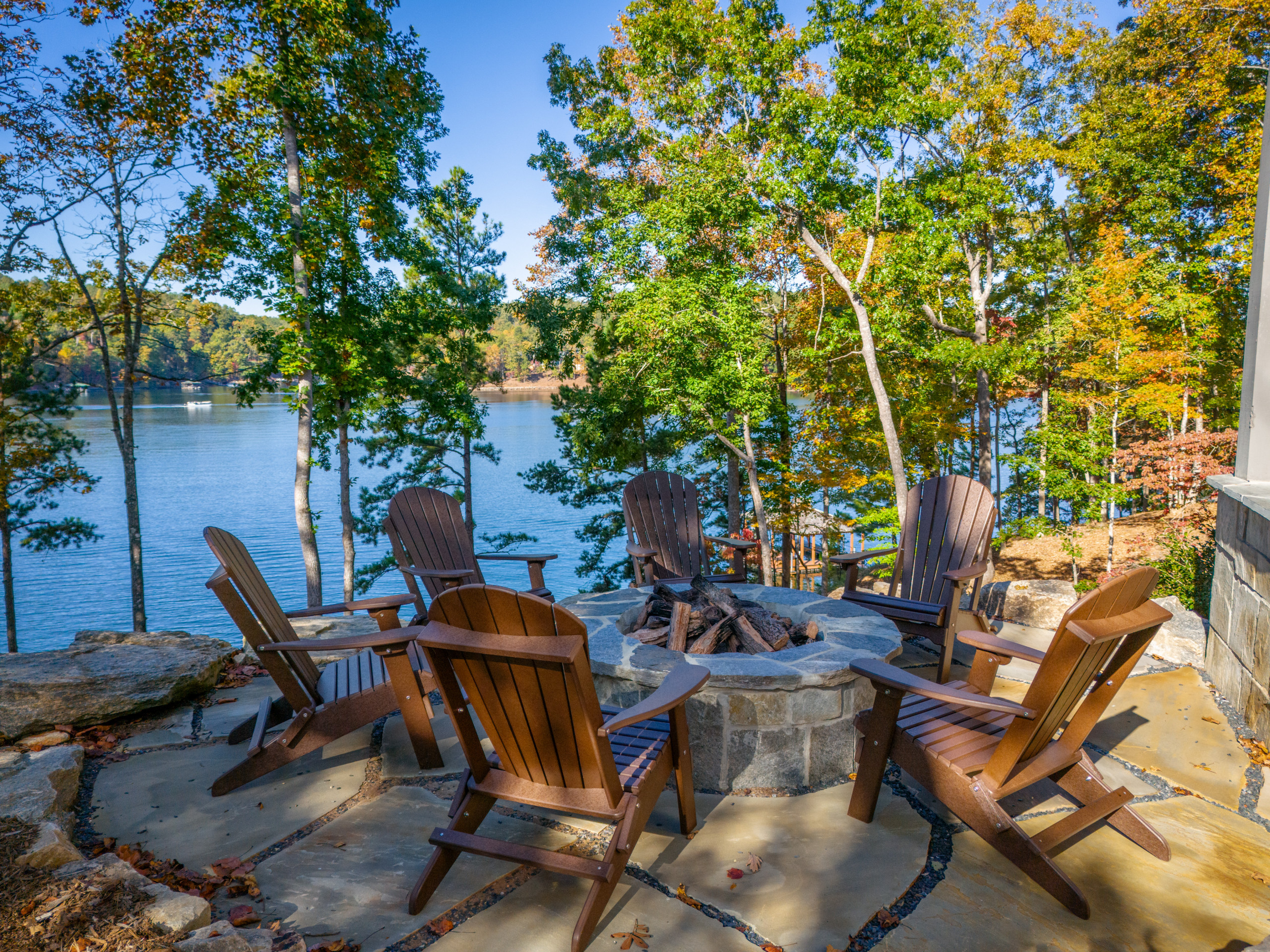 Here’s the fire pit patio that offers a perch closer to the water. Large flagstones and boulders show how the landscape design becomes more rugged farther away from the house. Steps from here lead down to the lake, which has a sandy beach.